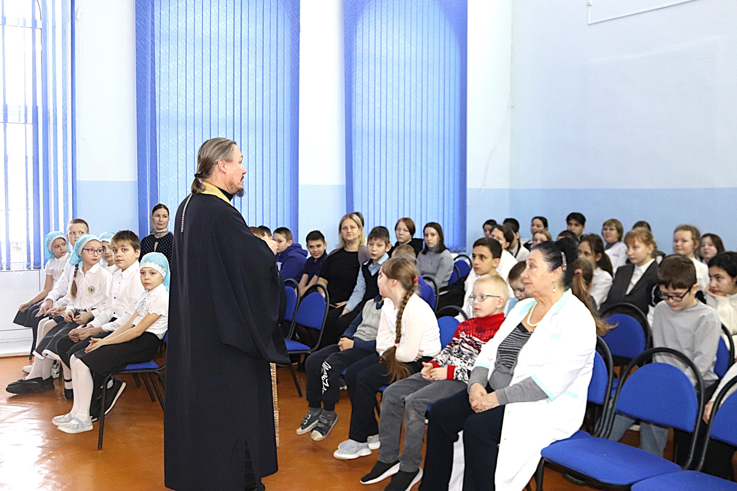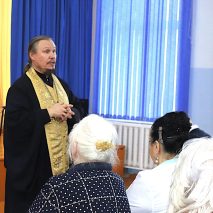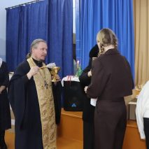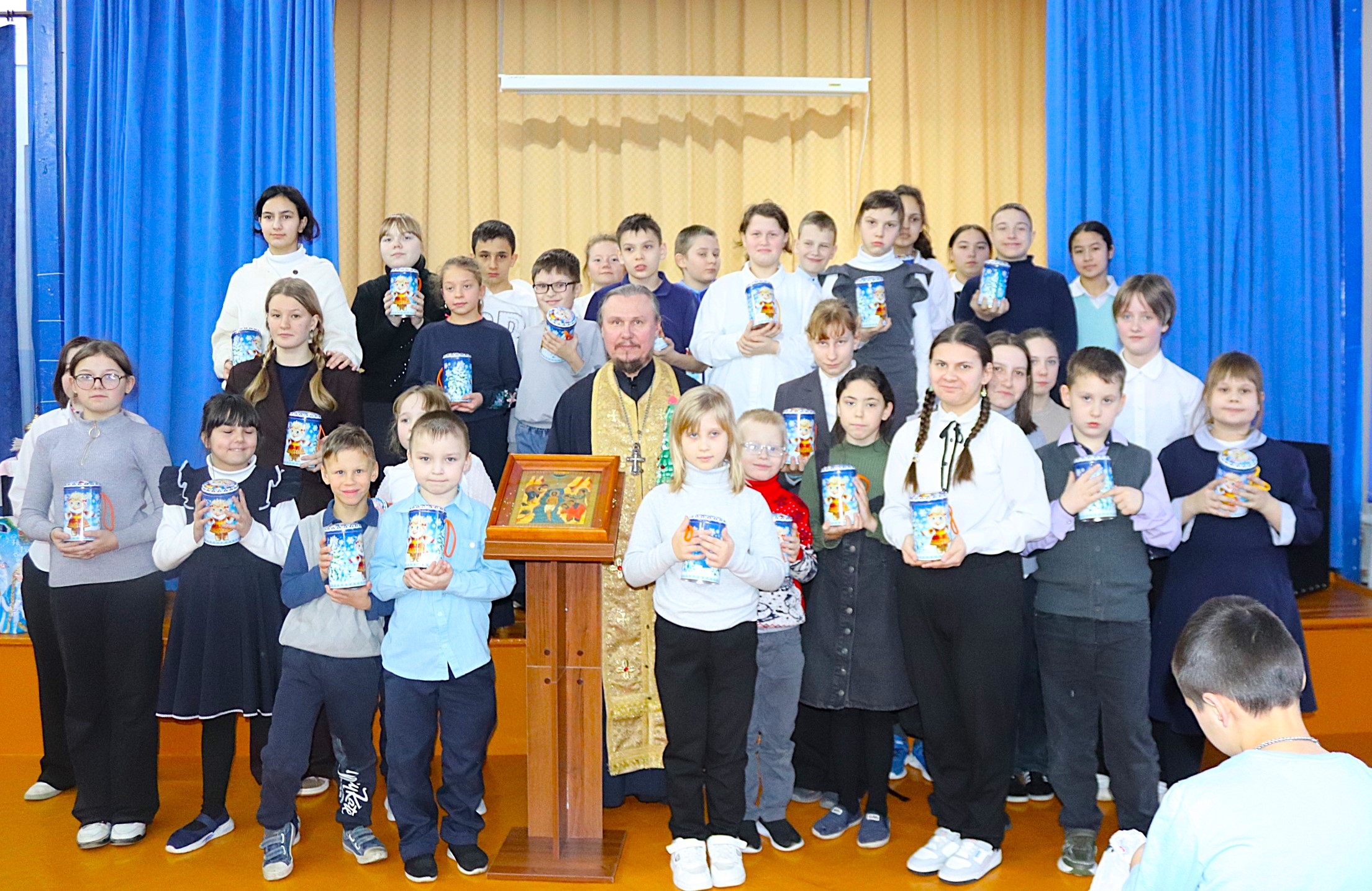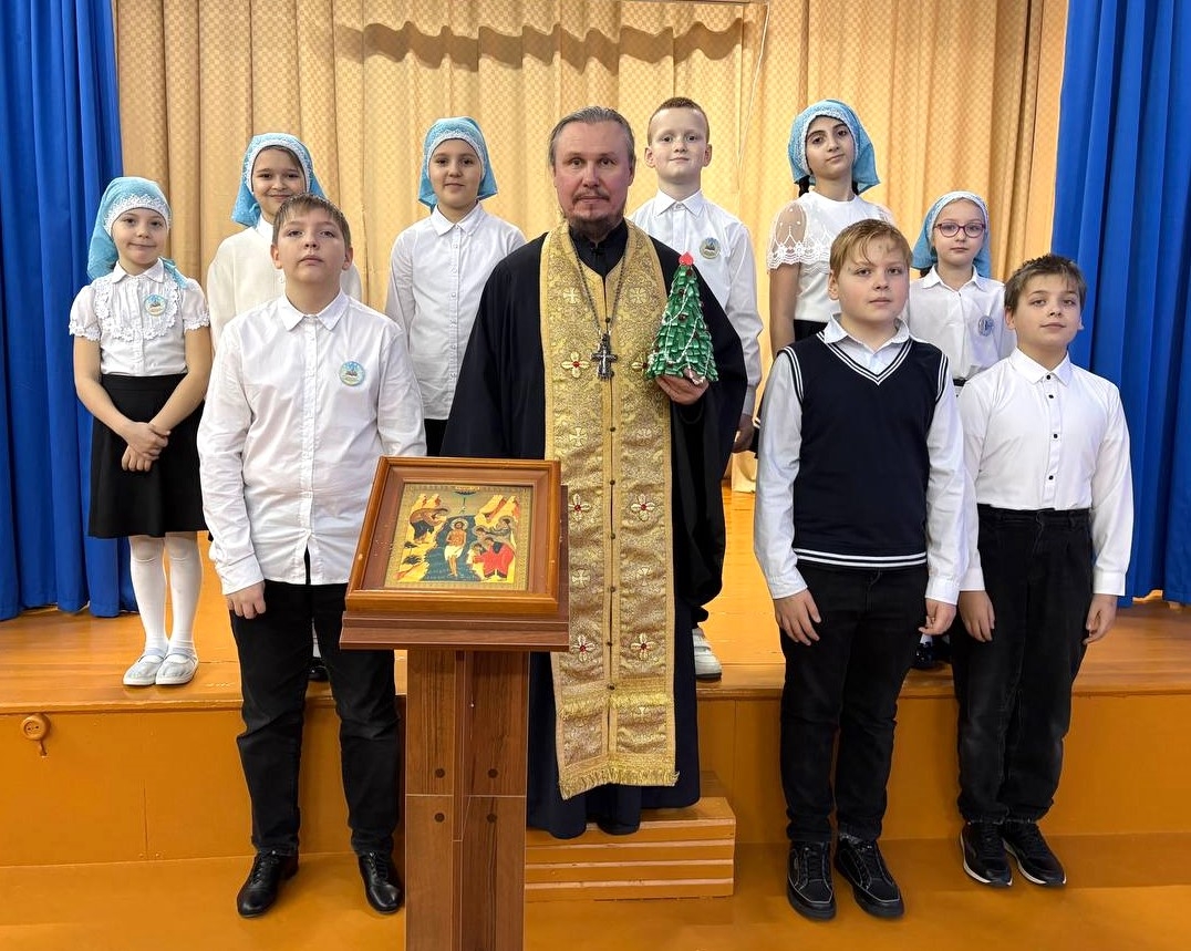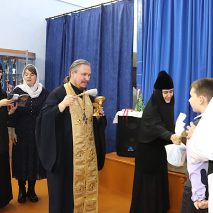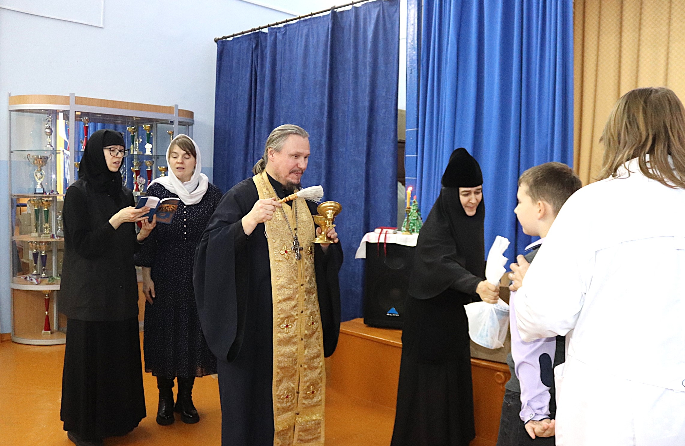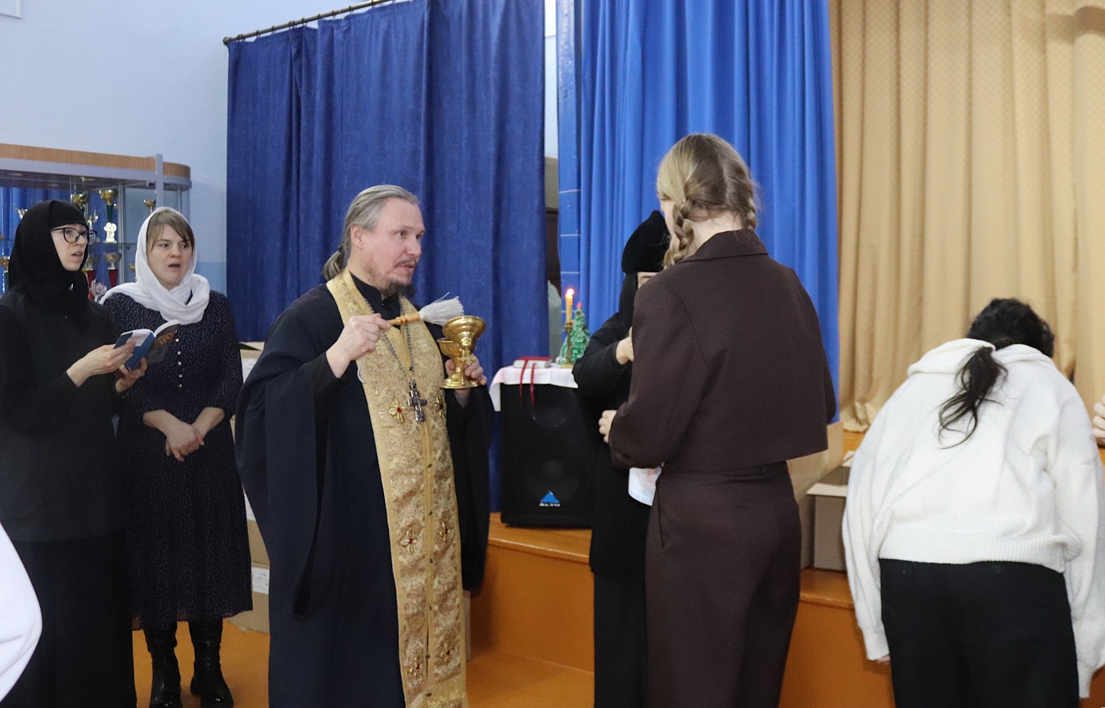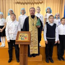 По сложившейся традиции, иерей Сергий обратился к собравшимся с пастырским словом. В своем обращении он раскрыл смысл великого события Рождества Христова. Вместе с батюшкой дети и педагоги совершили совместную молитву «Отче наш» и услышали праздничные Евангельские чтения.