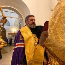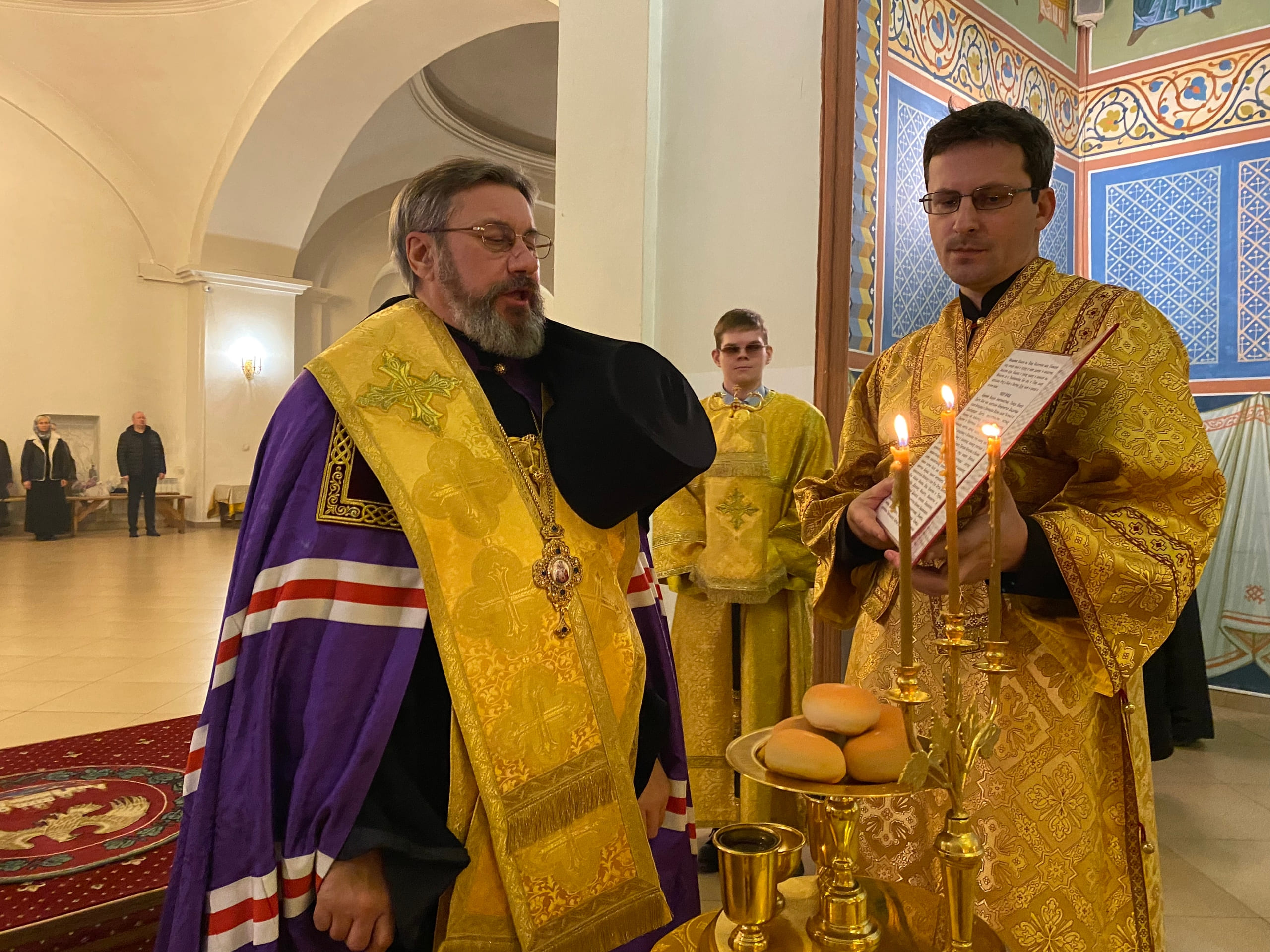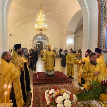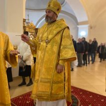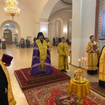 Его Преосвященству сослужили: секретарь епархиального управления иерей Антоний Чуть, иерей Алексий Ануфриев, иерей Виталий Ярмулик, иерей Олег Федоров и иерей Алексий Беляков.