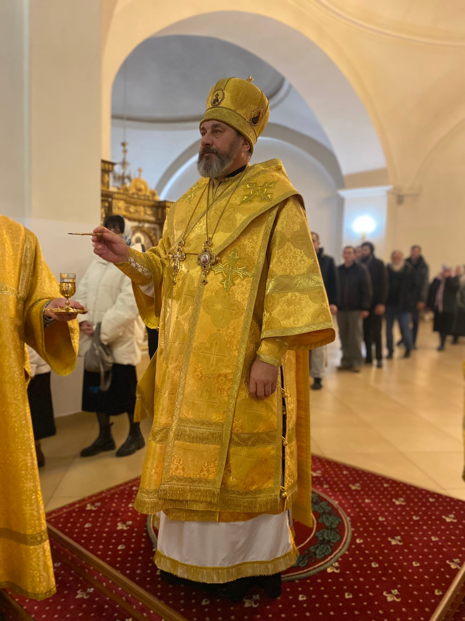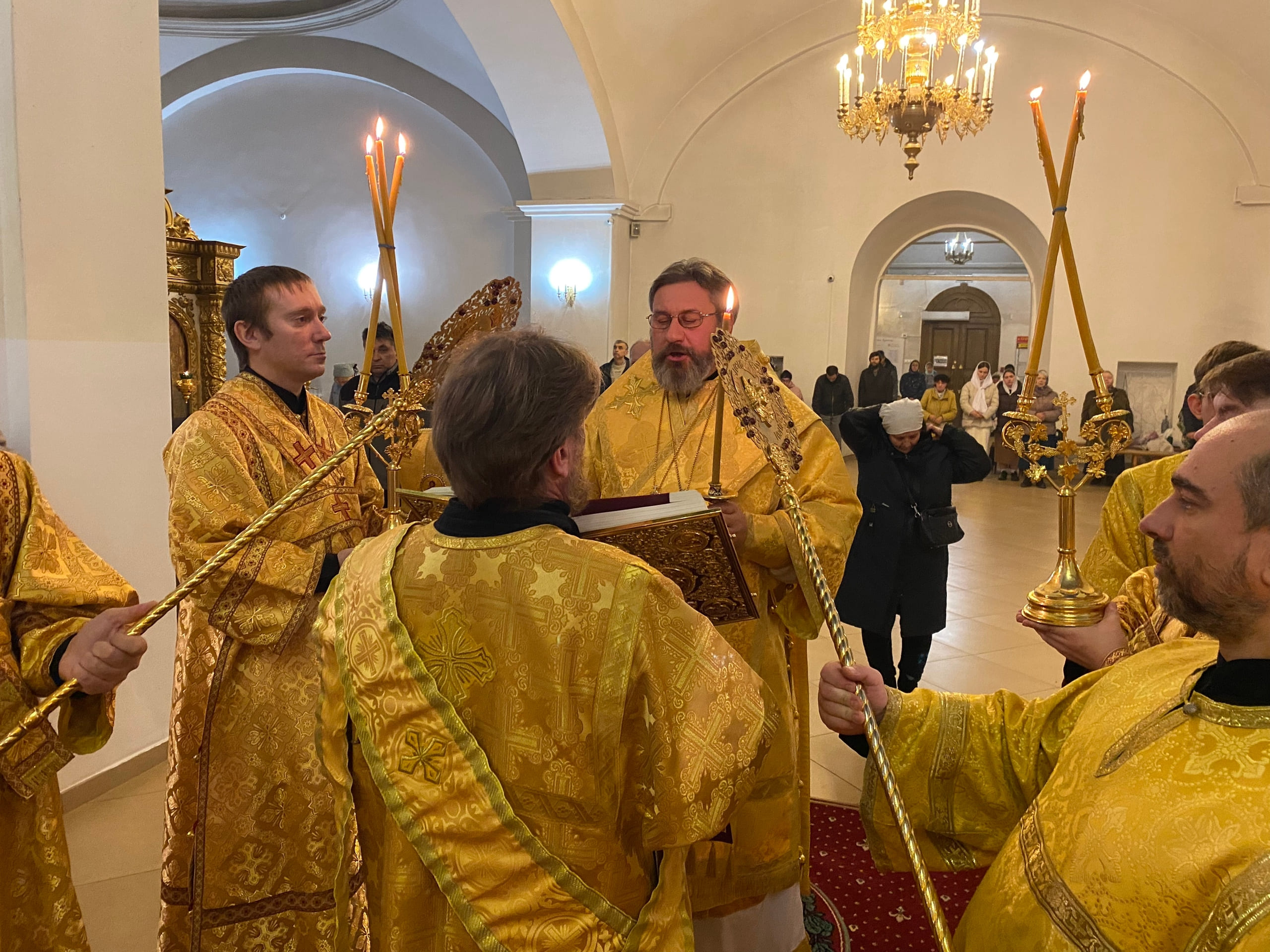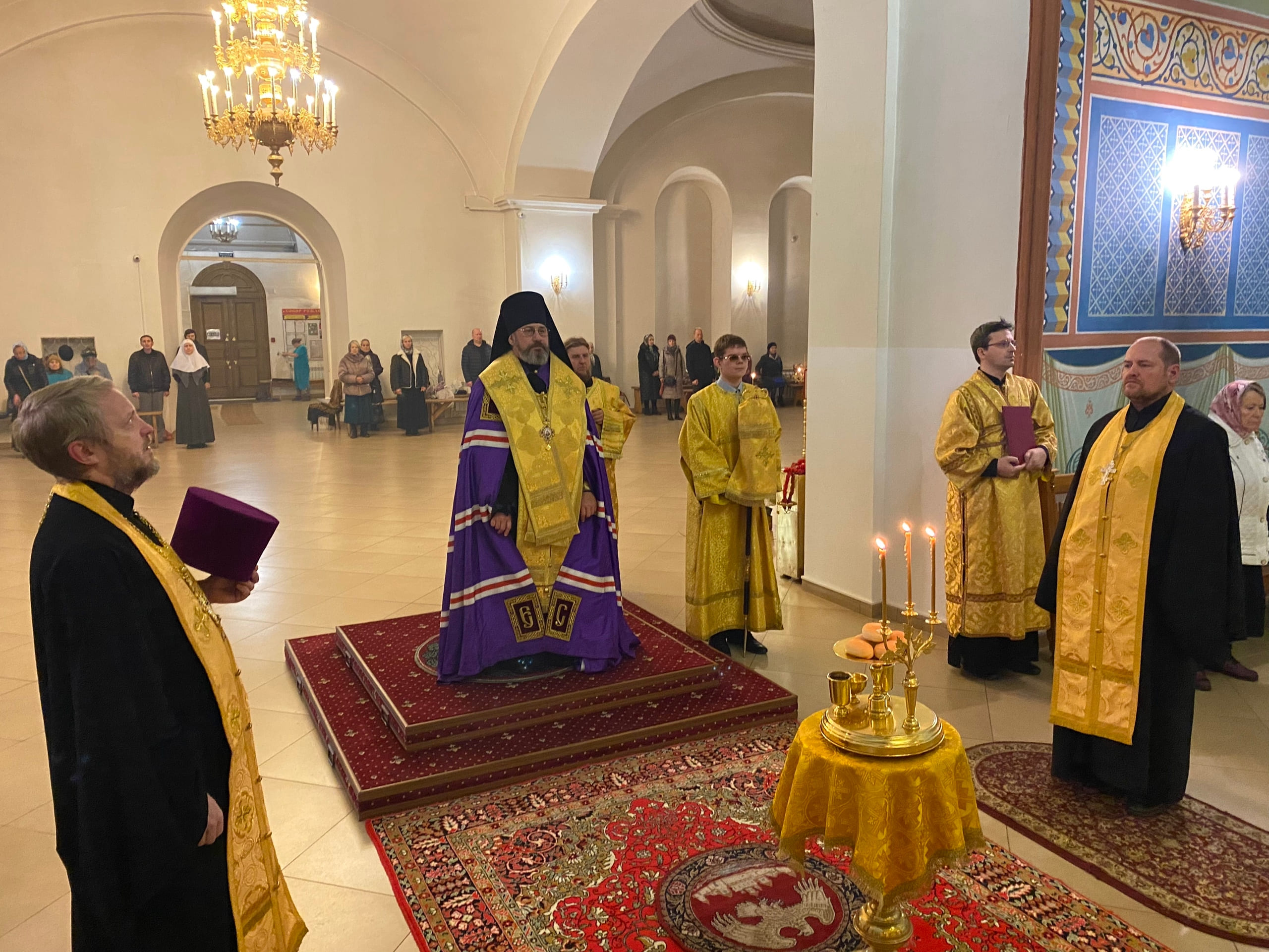 Его Преосвященству сослужили: секретарь епархиального управления иерей Антоний Чуть, иерей Алексий Ануфриев, иерей Виталий Ярмулик, иерей Олег Федоров и иерей Алексий Беляков.