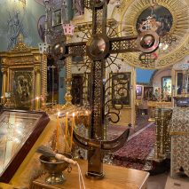 У входа в храм архипастыря встретил настоятель игумен Георгий (Хлебников). После чтения молитв Владыка окропил крест святой водой и благословил его на установку.