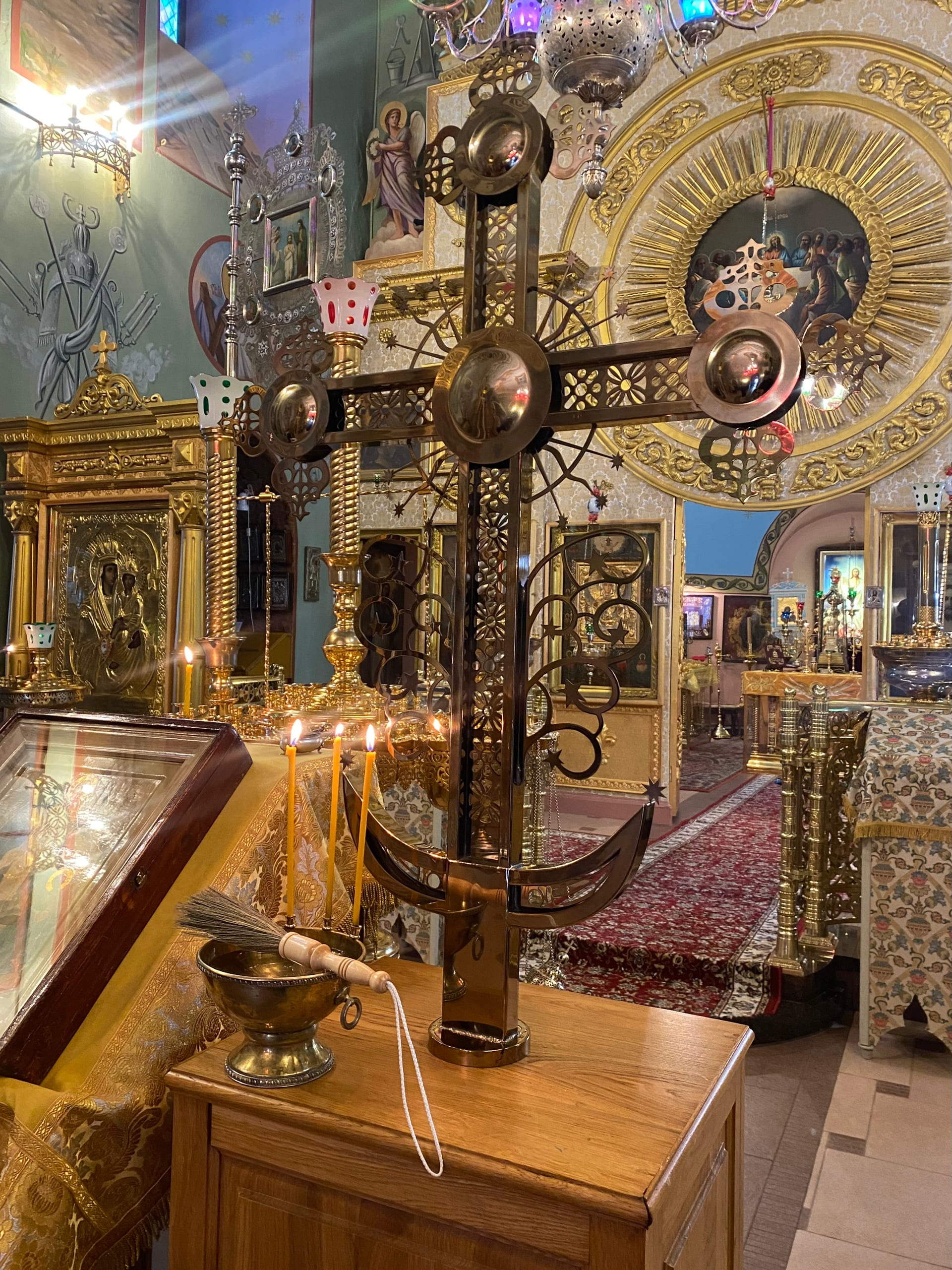 У входа в храм архипастыря встретил настоятель игумен Георгий (Хлебников). После чтения молитв Владыка окропил крест святой водой и благословил его на установку.
