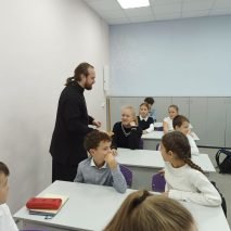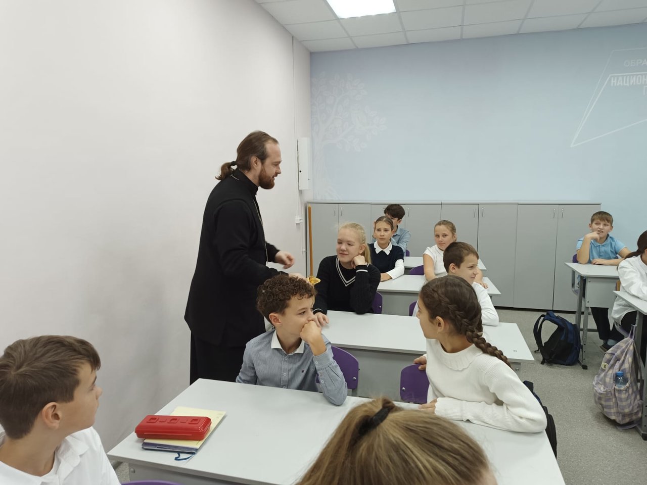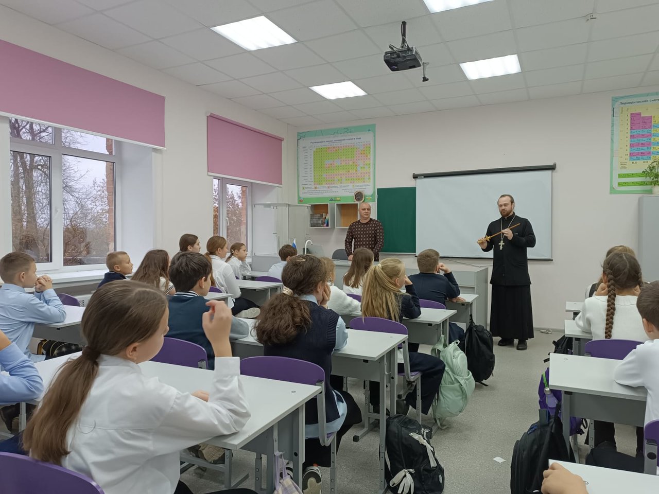 13 октября 2025 года в МБОУ СОШ № 2 г. Киржача в рамках урока для учащихся 5-го класса, посвященного теме «Как понять друг друга разным поколениям?», состоялась встреча с помощником благочинного по работе с молодежью Киржачского округа, иереем Дмитрием Чибесковым, и главным специалистом МКУ ЦРОДОУ Т.В. Соловьевой.