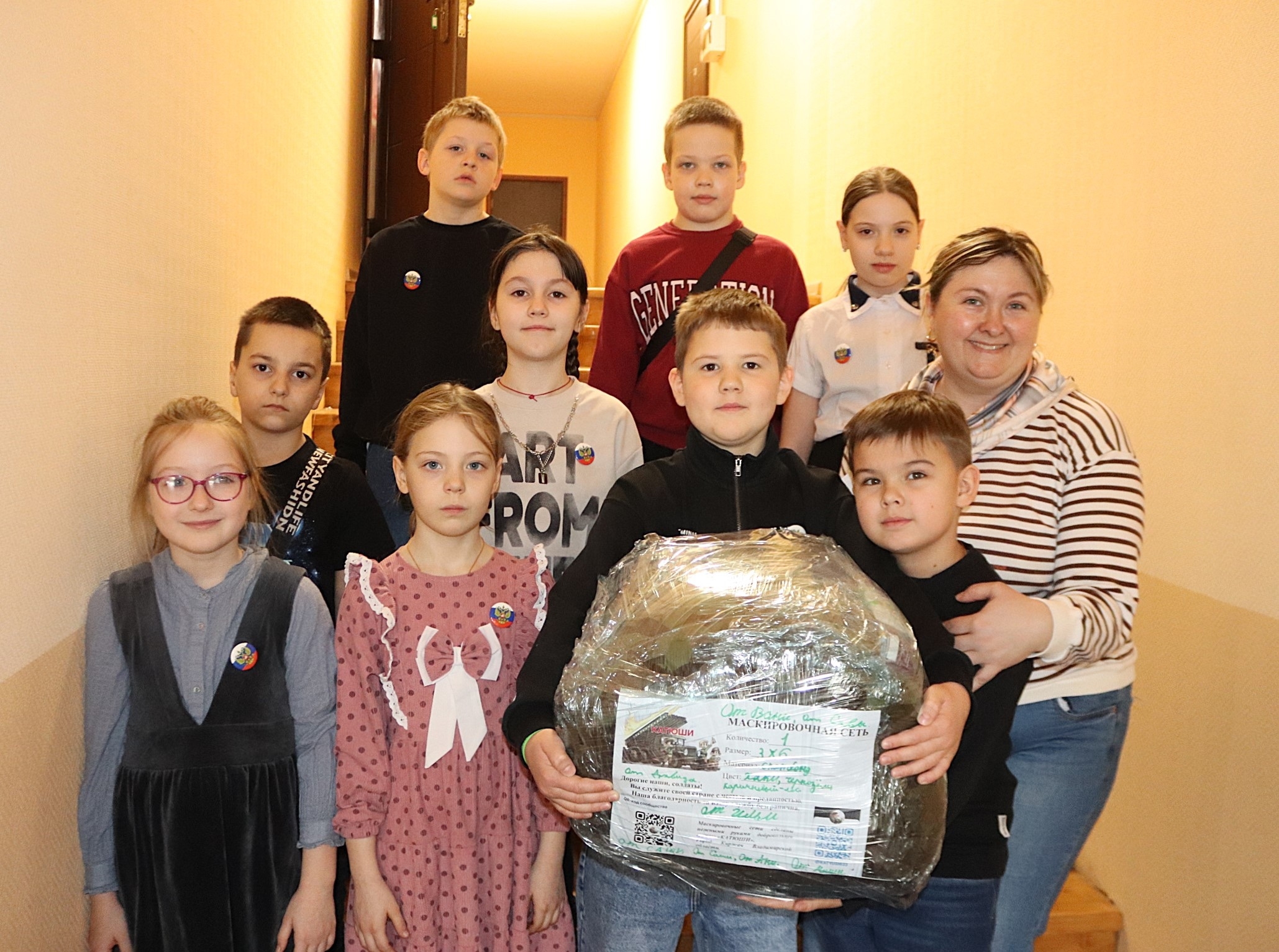 Ребята узнали о деятельности добровольцев и помощи фронту, после чего приступили к практике: нарезали ленты на станке, под руководством наставницы вплетали их в основу, а затем сняли и сложили готовое изделие по правилам быстрой распаковки. При участии добровольца Марины Викторовны Княжевой воспитанники упаковали сеть и вложили в неё письма для бойцов. Сладкие угощения, переданные детьми, будут направлены в зону СВО отдельным грузом.