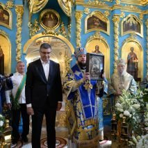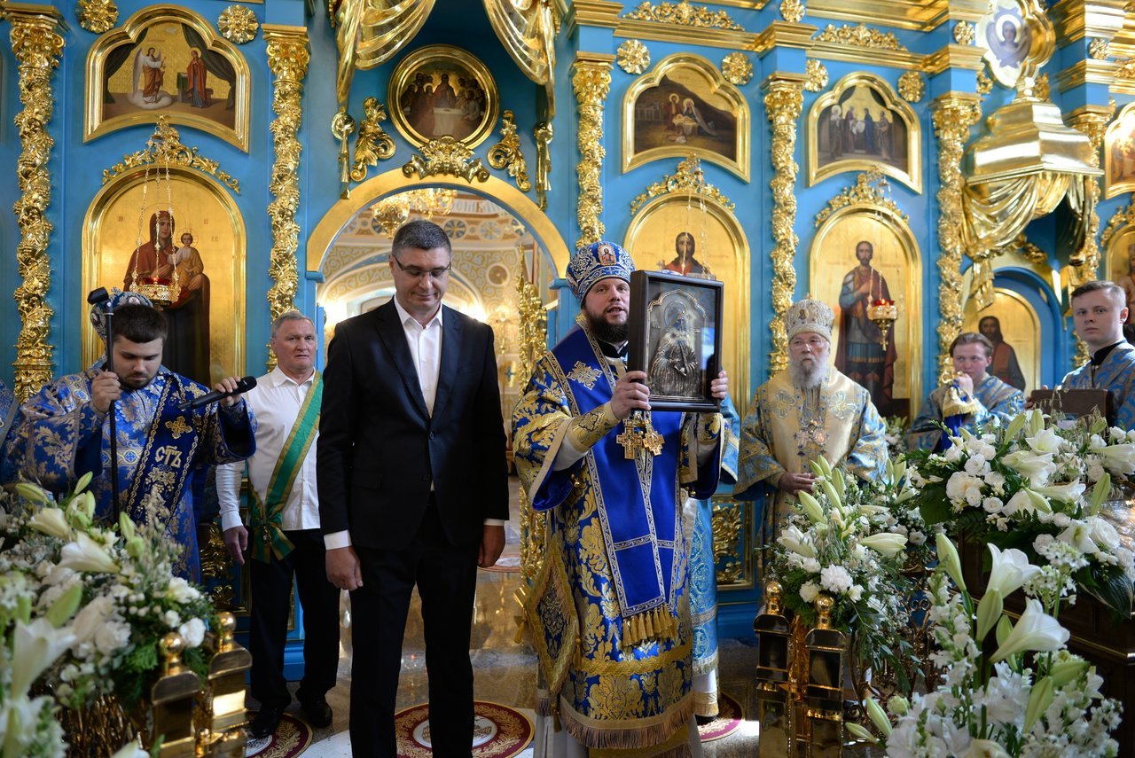 По окончании Литургии губернатор Александр Авдеев передал храму в дар образ преподобного Сергия Радонежского, а митрополит Никандр вручил главе региона икону Смоленской Божией Матери.