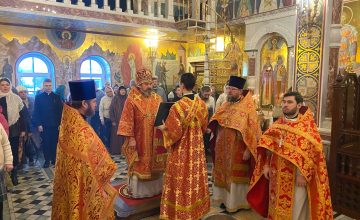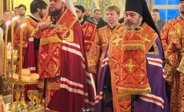 Его Преосвященству сослужили: секретарь епархиального управления иерей Антоний Чуть, благочинный Покровского церковного округа протоиерей Николай Романович, настоятель храма протоиерей Александр Кузин и иерей Илья Кадеров.