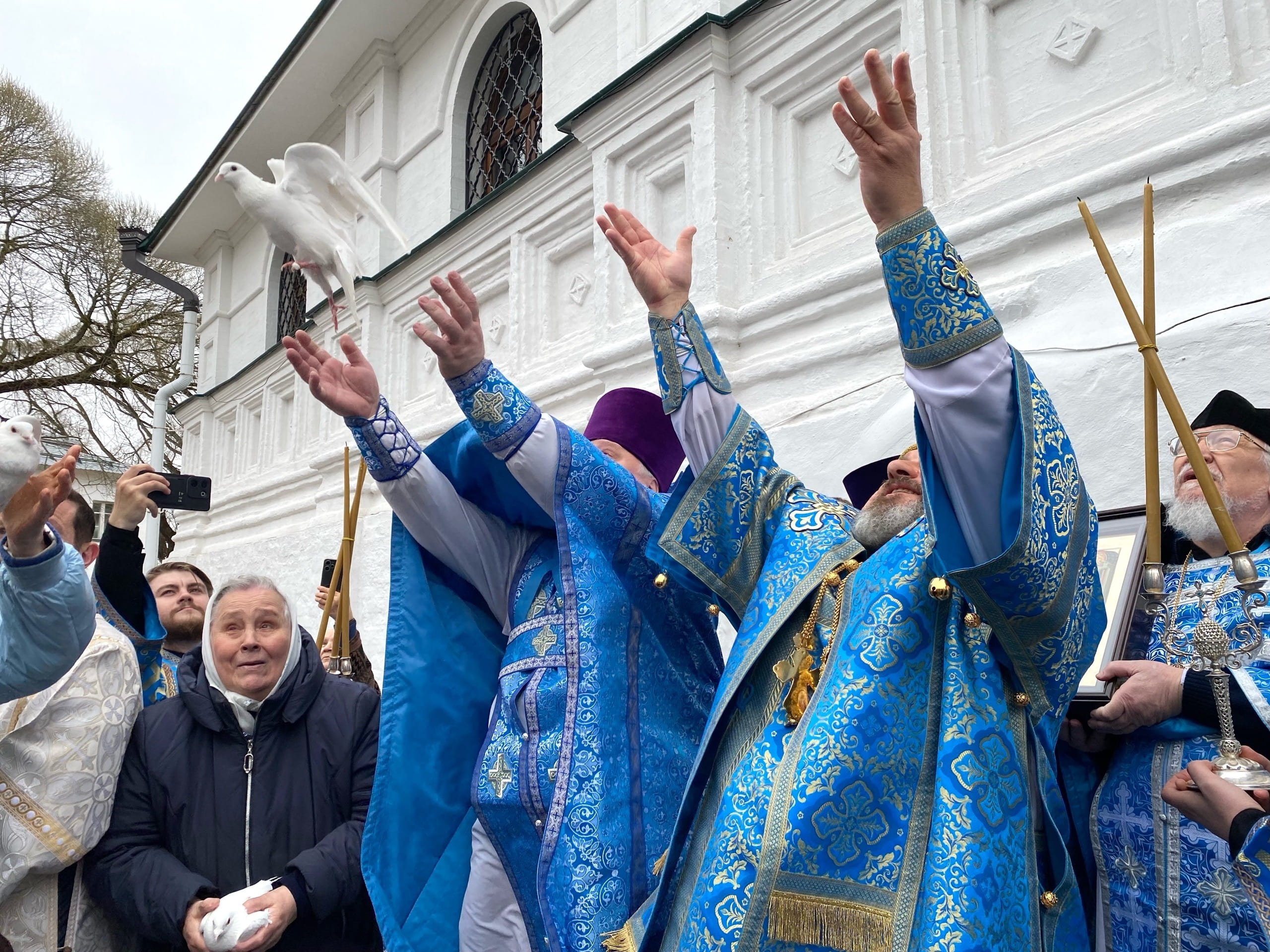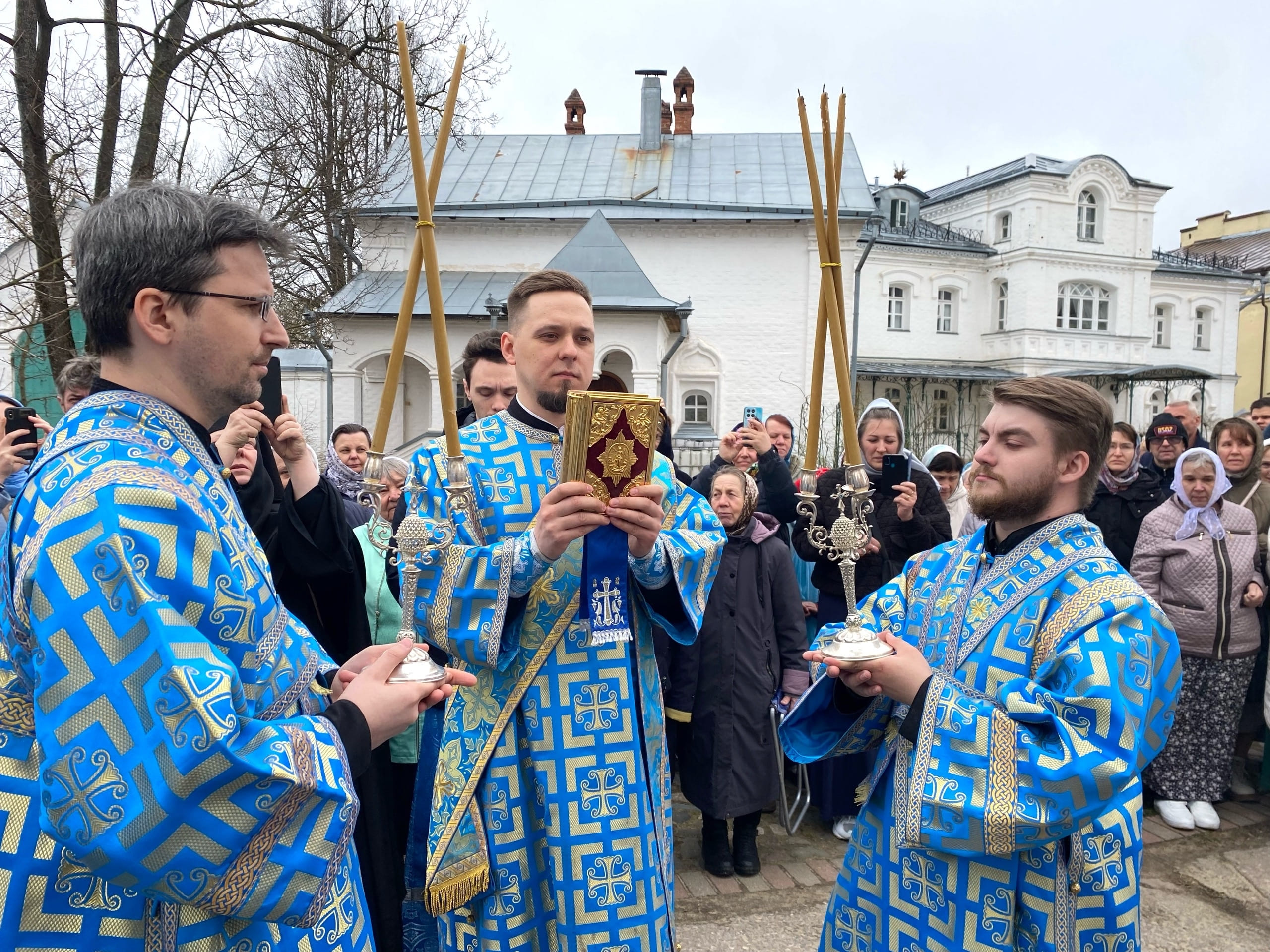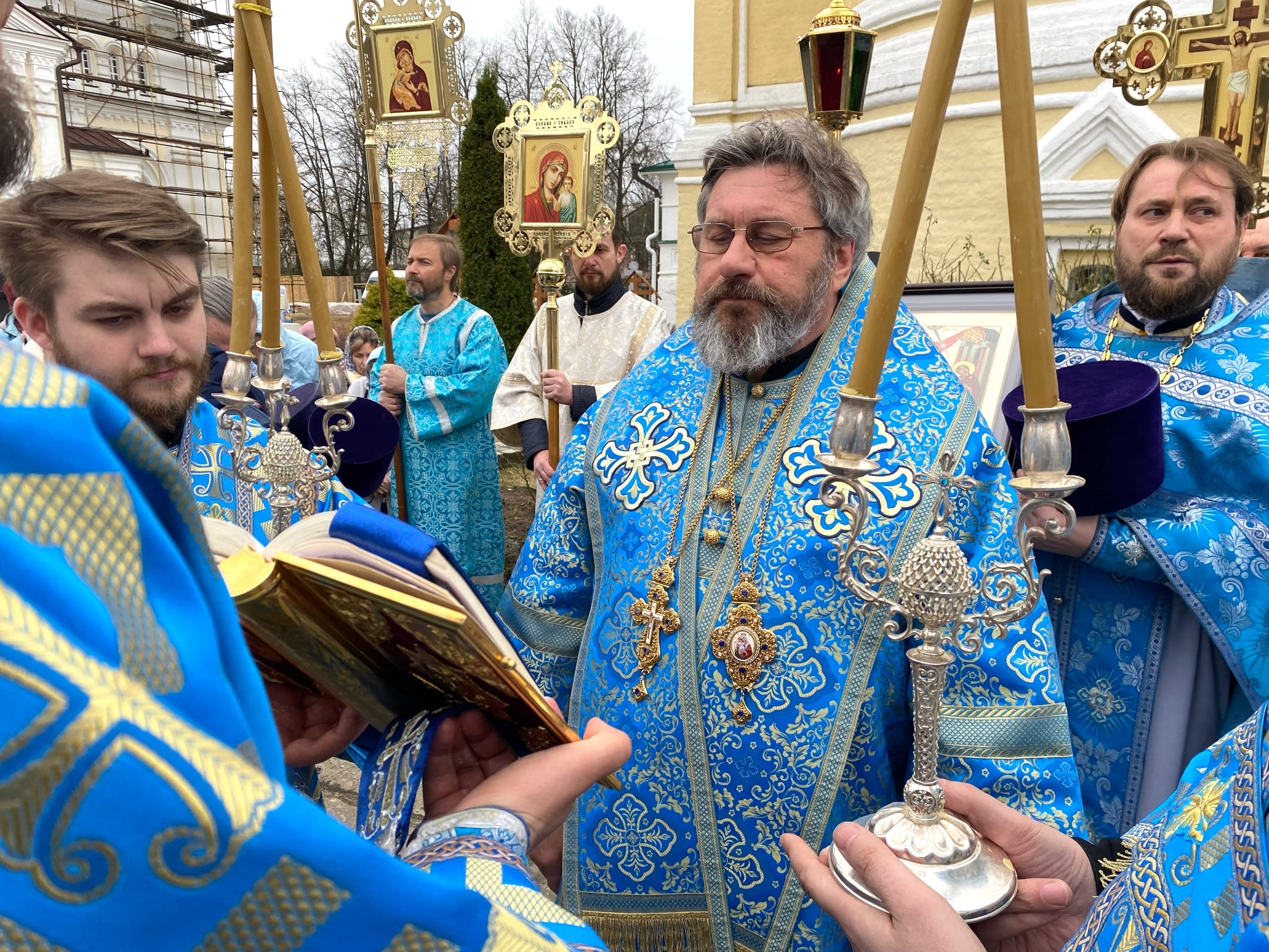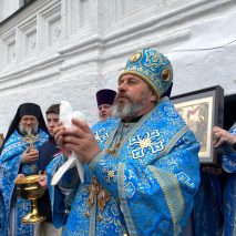 В завершение Божественной литургии вокруг Благовещенского собора был совершен крестный ход. Обойдя храм, шествие проследовал в храм прп. Романа Киржачского, где перед Его святыми мощами был совершен чин славления.