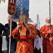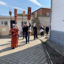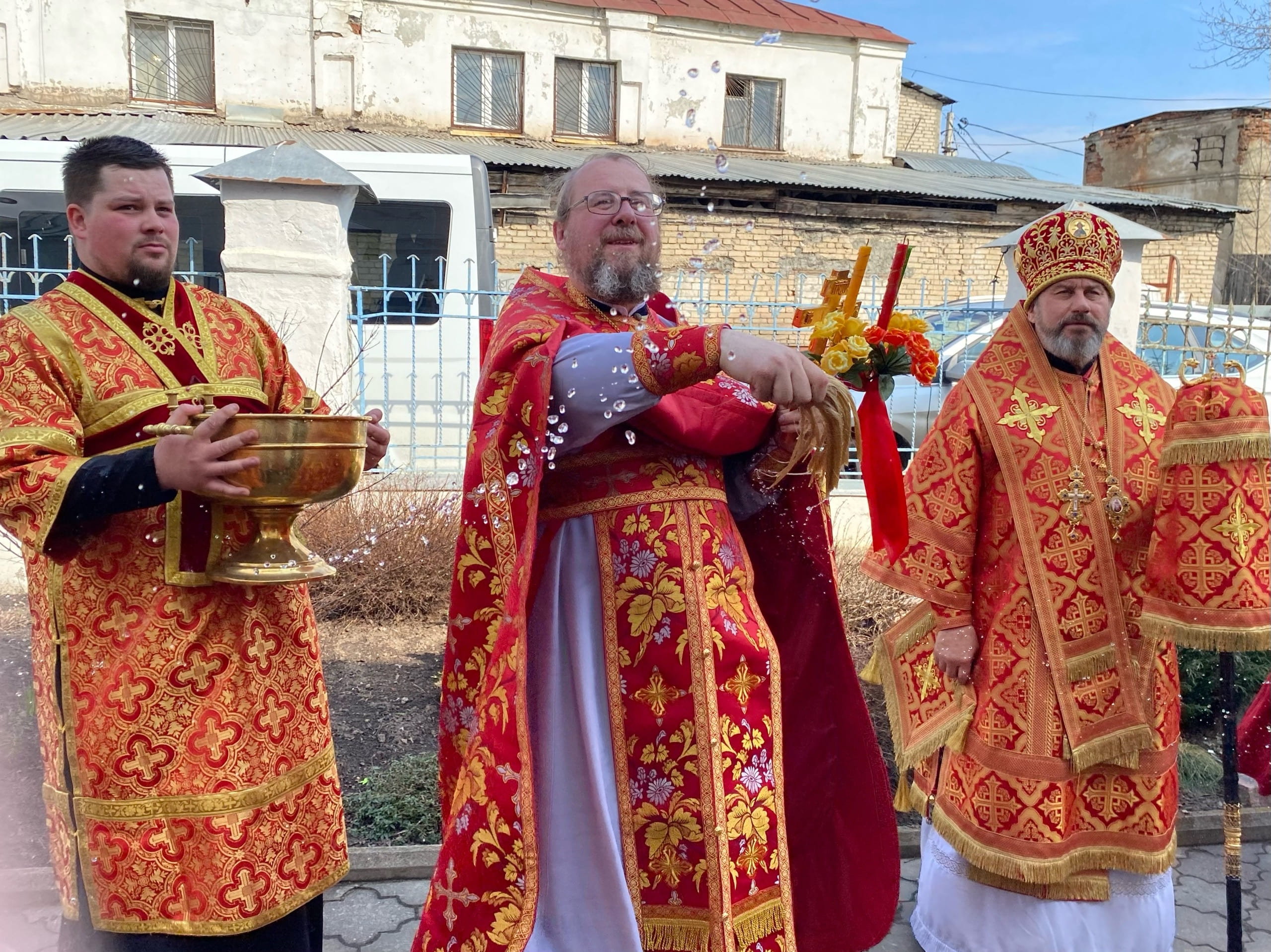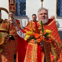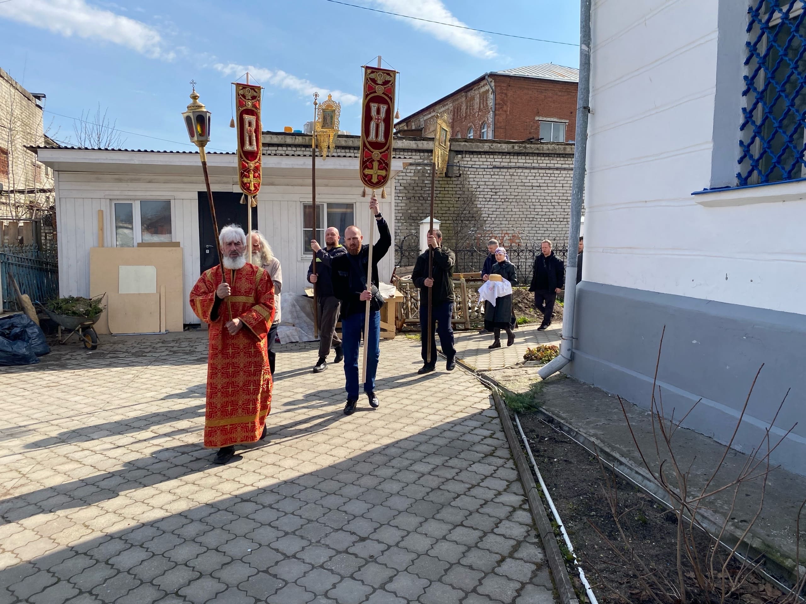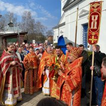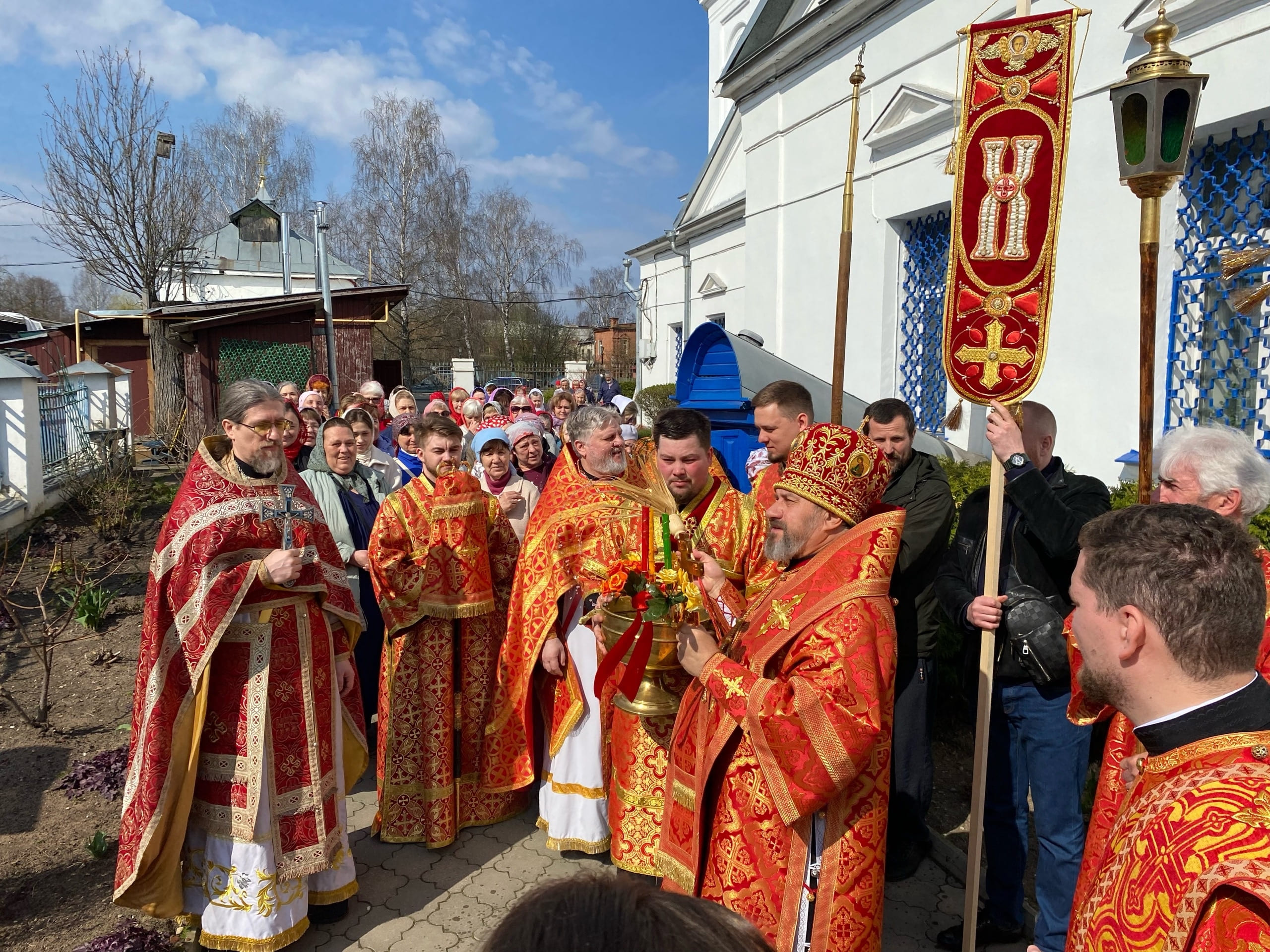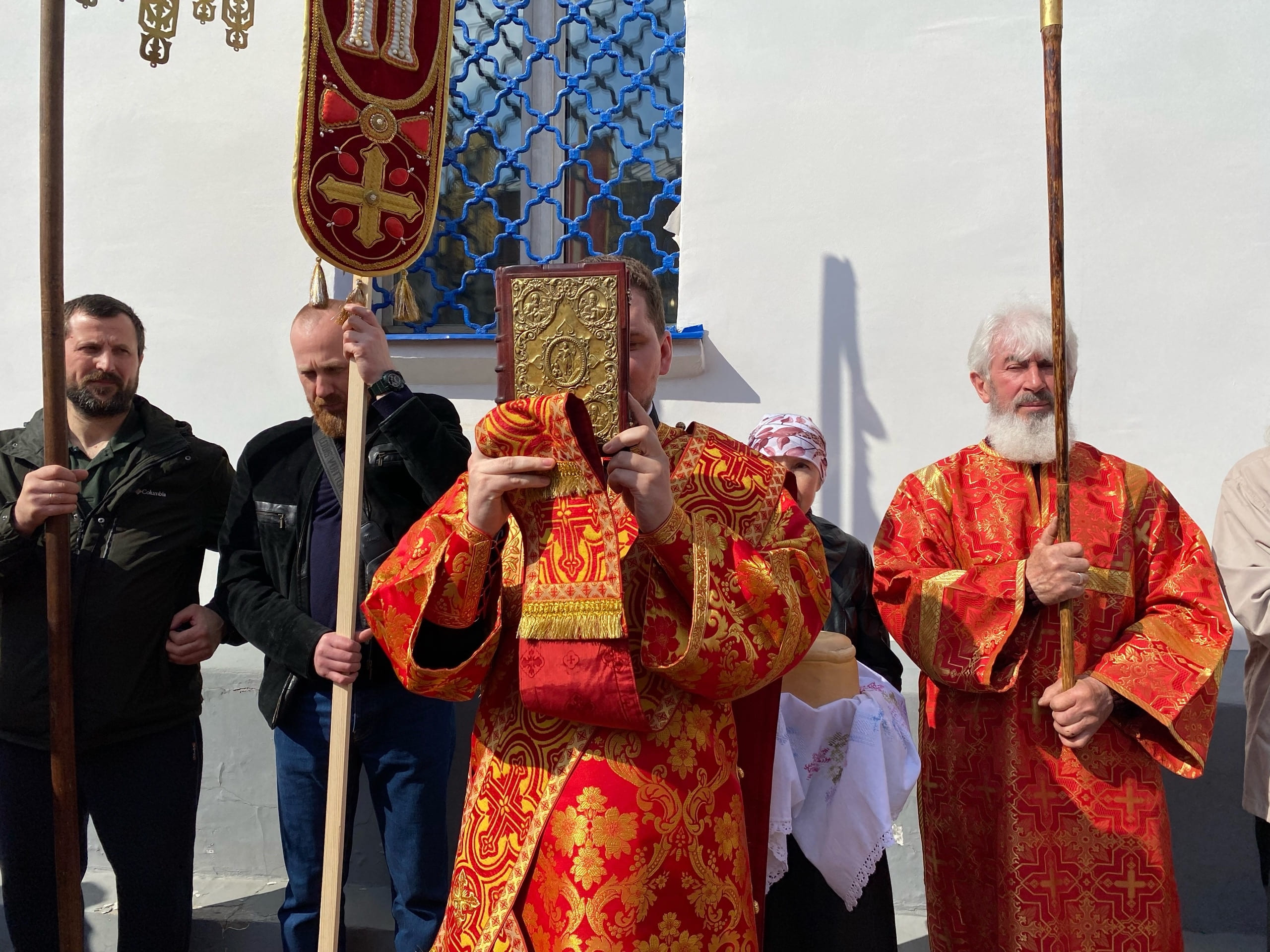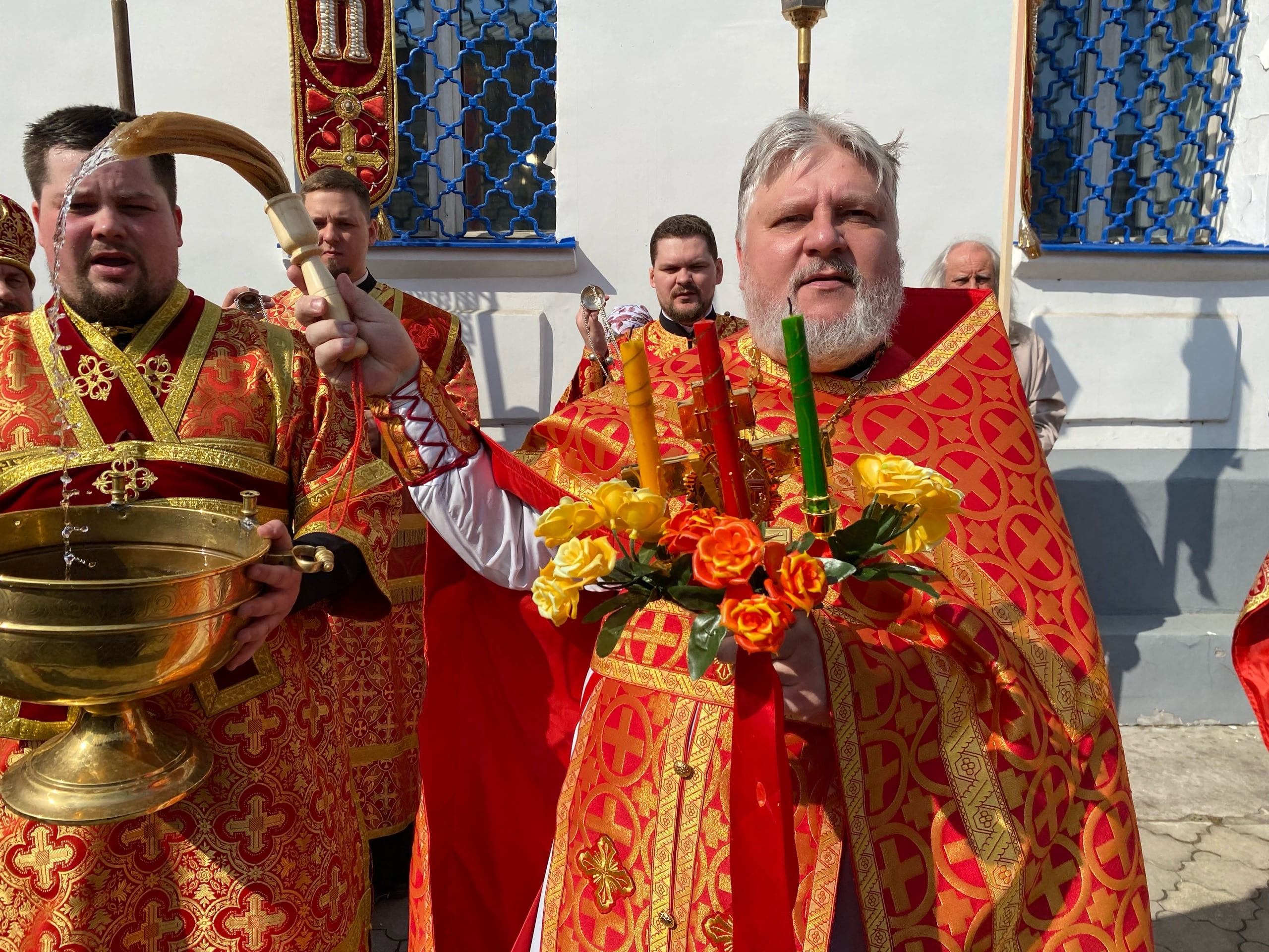 В завершении литургии архипастырь совершил освящение воды, после чего под пение пасхальных песнопений вокруг храма был совершен крестный ход.