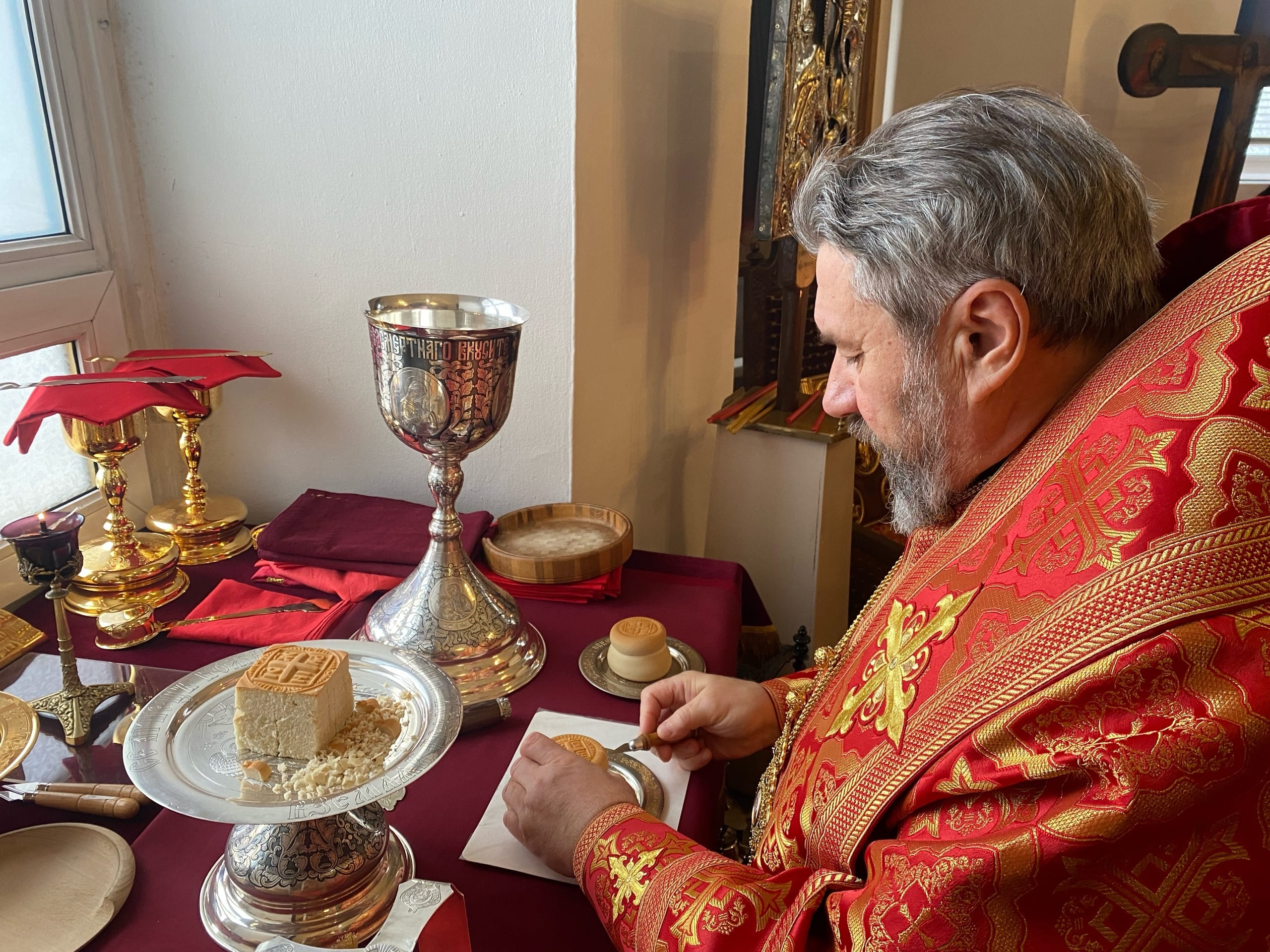 По заамвонной молитве владыка прочитал молитву на раздробление артоса — особого освященного хлеба, символизирующего Воскресшего Христа.