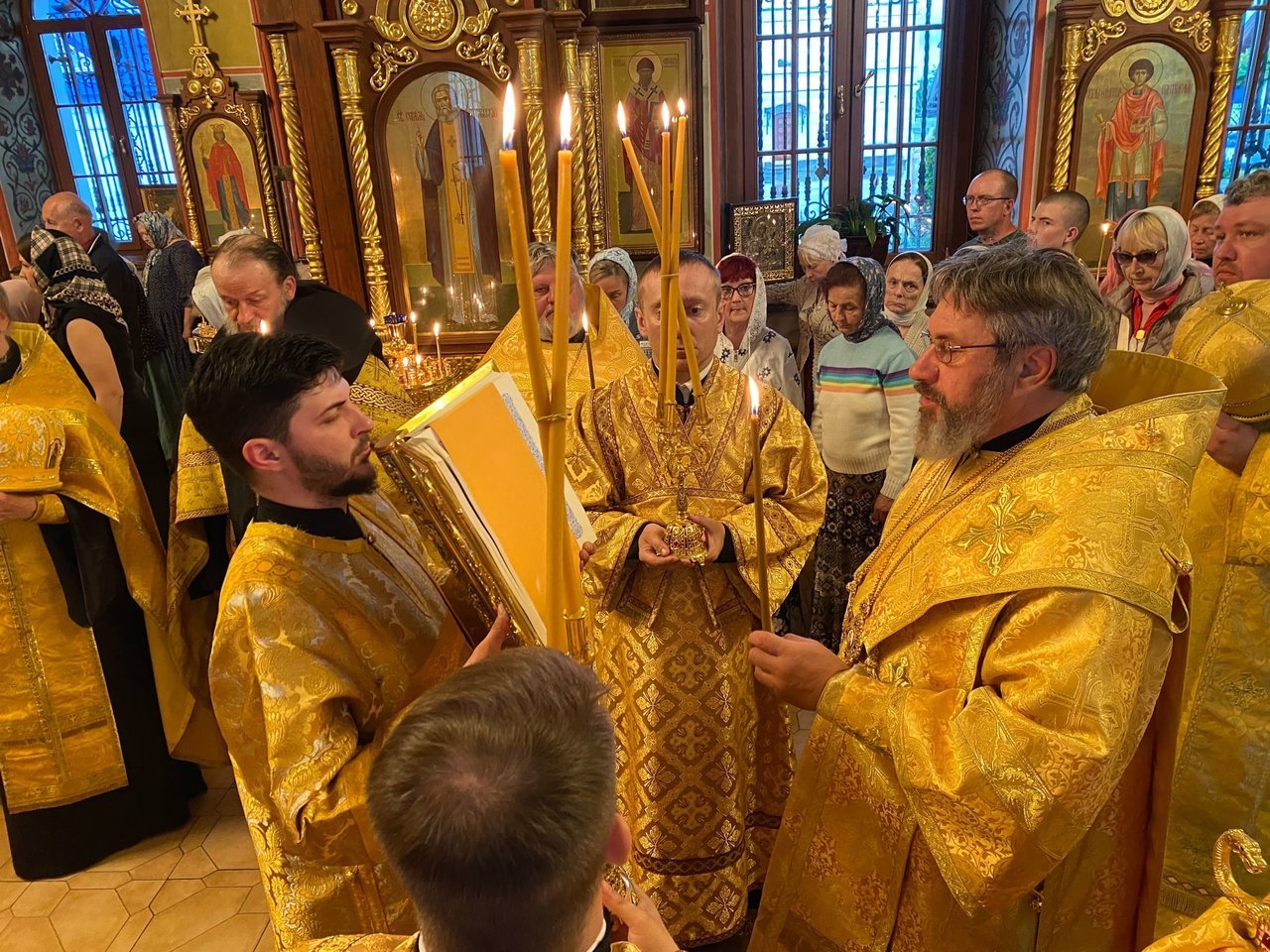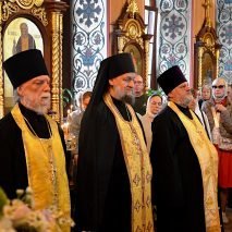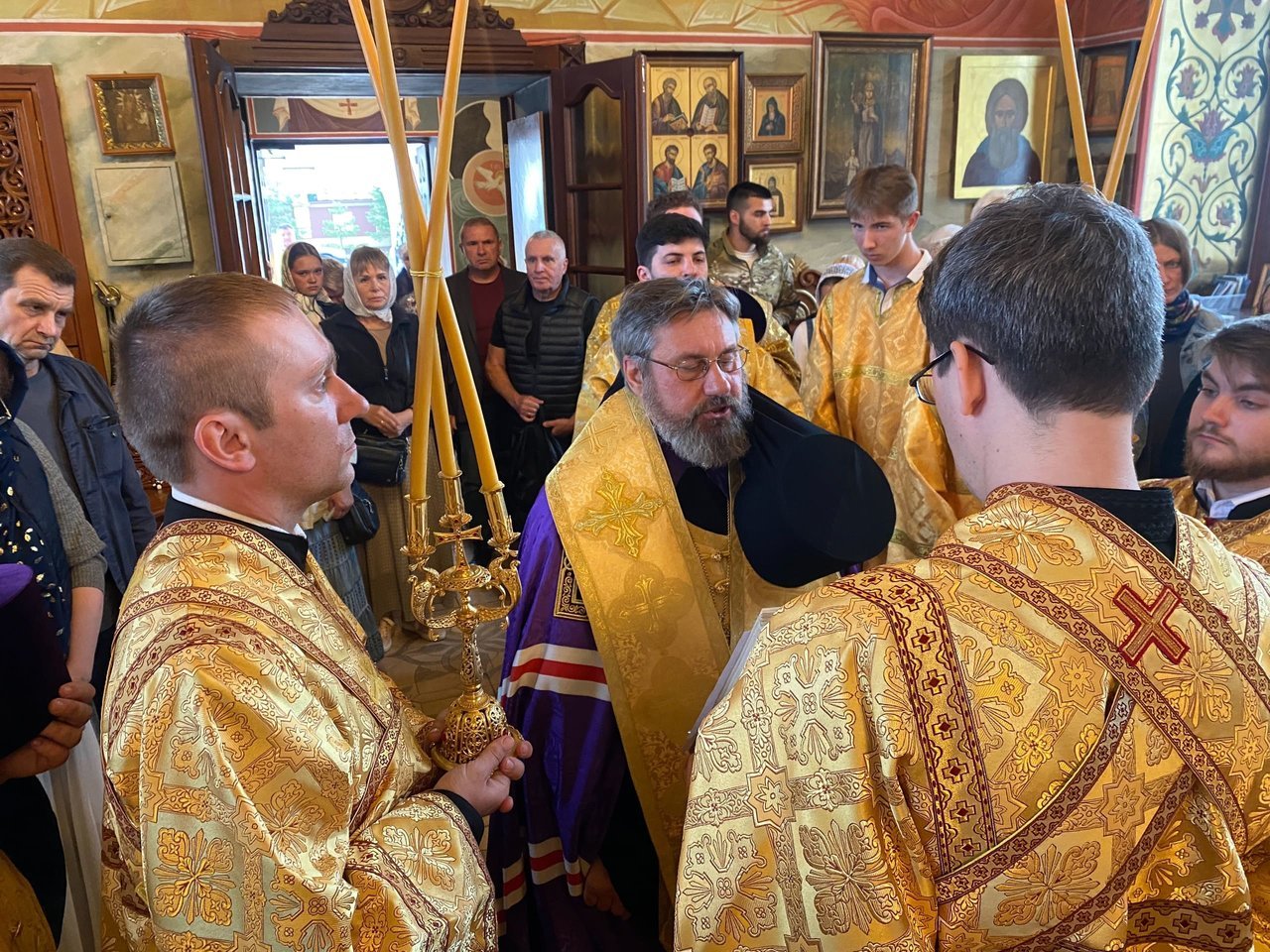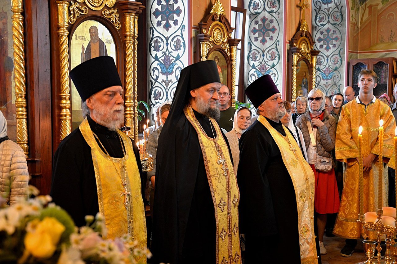 Его Преосвященству сослужили: секретарь епархиального управления иерей Антоний Чуть, благочинный Покровского церковного округа протоиерей Николай Романович, секретарь епархии по монастырям игумен Серафим (Котенев), настоятель храма протоиерей Александр Кузин и духовенство храма.