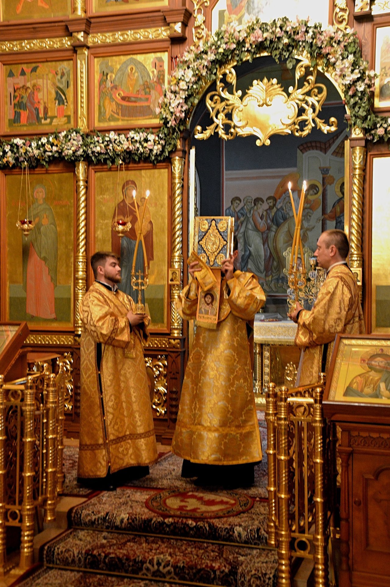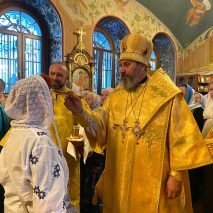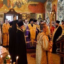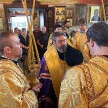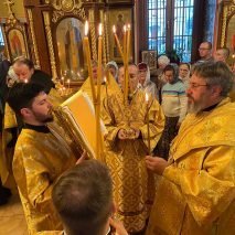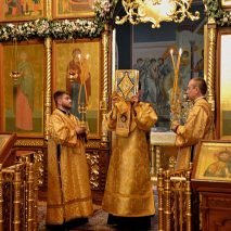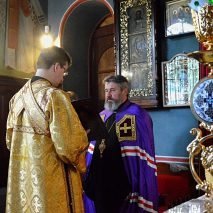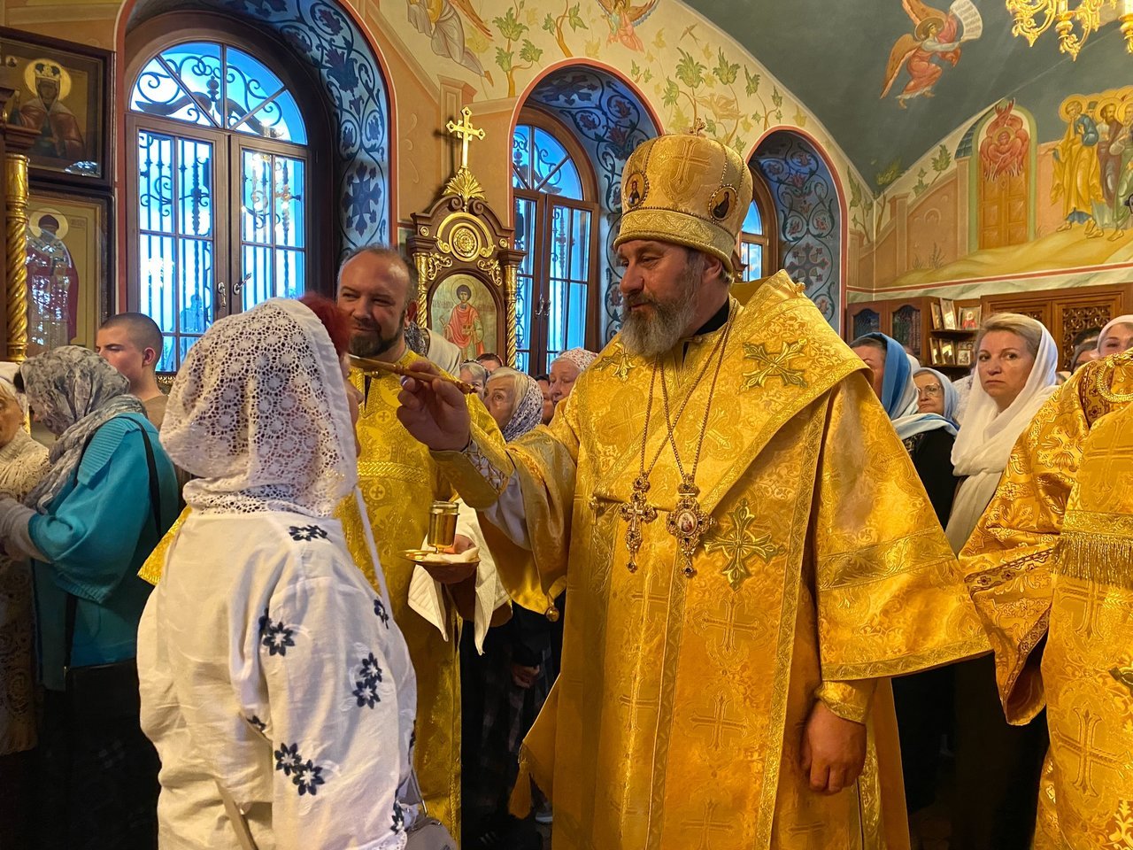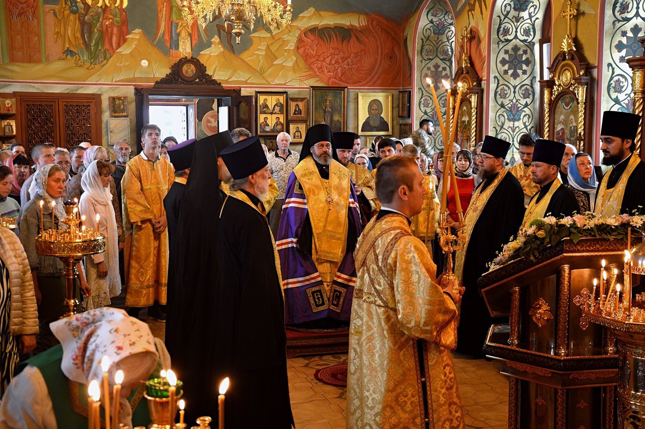 Его Преосвященству сослужили: секретарь епархиального управления иерей Антоний Чуть, благочинный Покровского церковного округа протоиерей Николай Романович, секретарь епархии по монастырям игумен Серафим (Котенев), настоятель храма протоиерей Александр Кузин и духовенство храма.