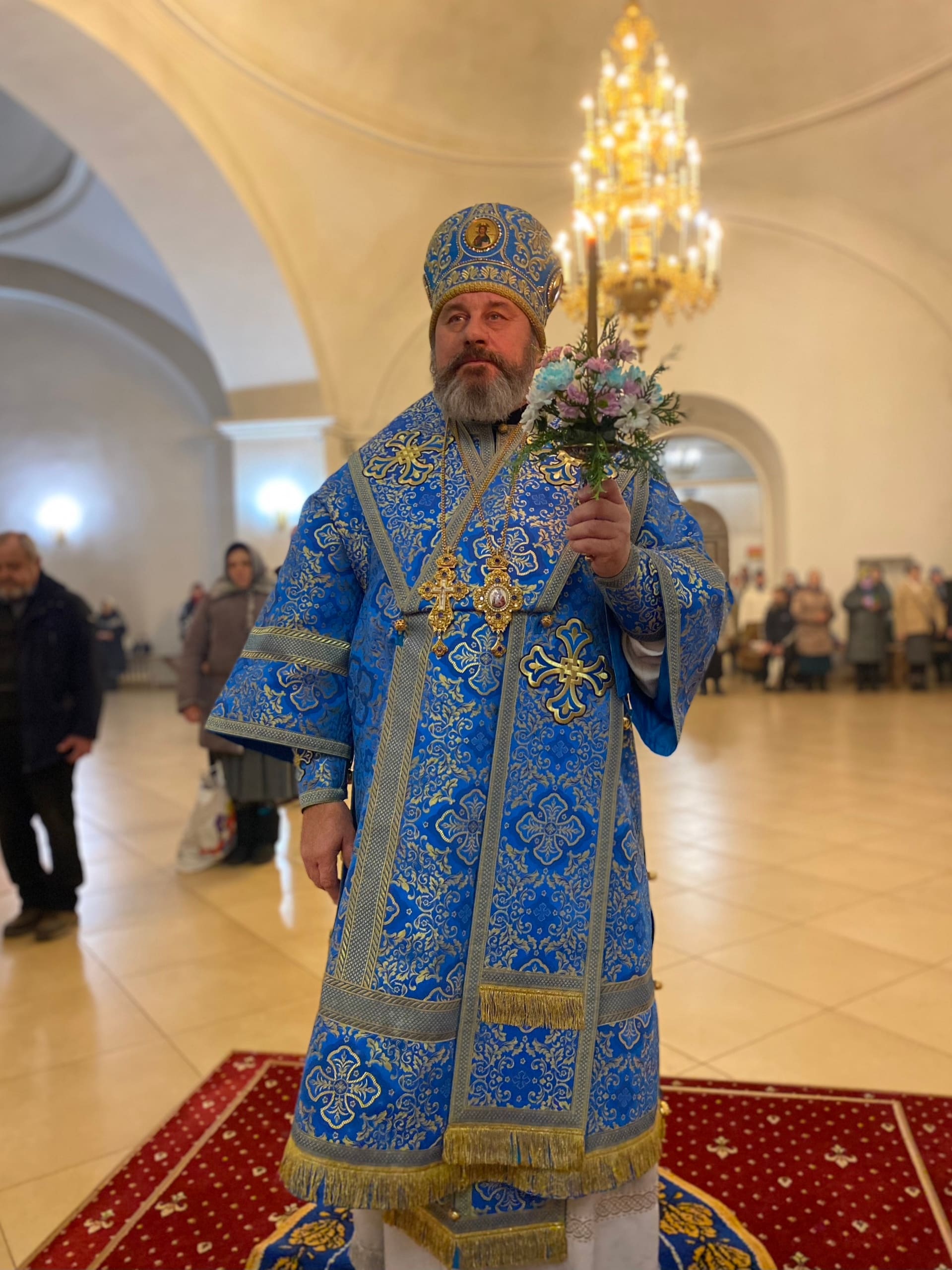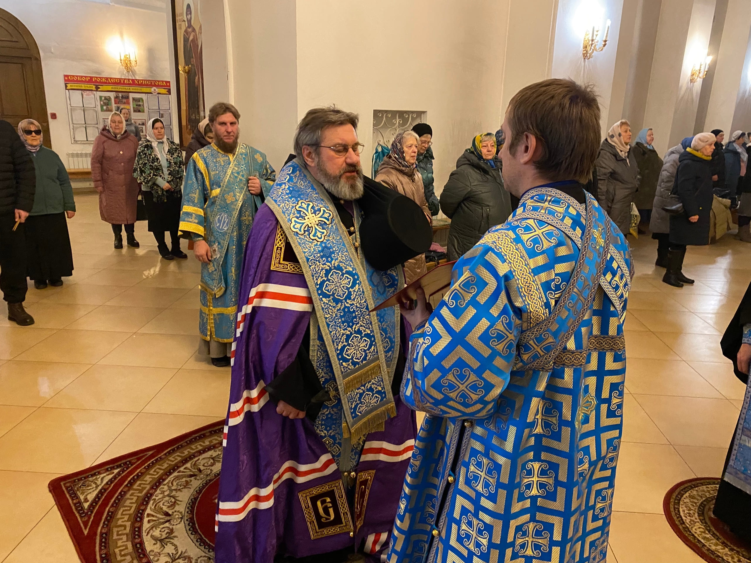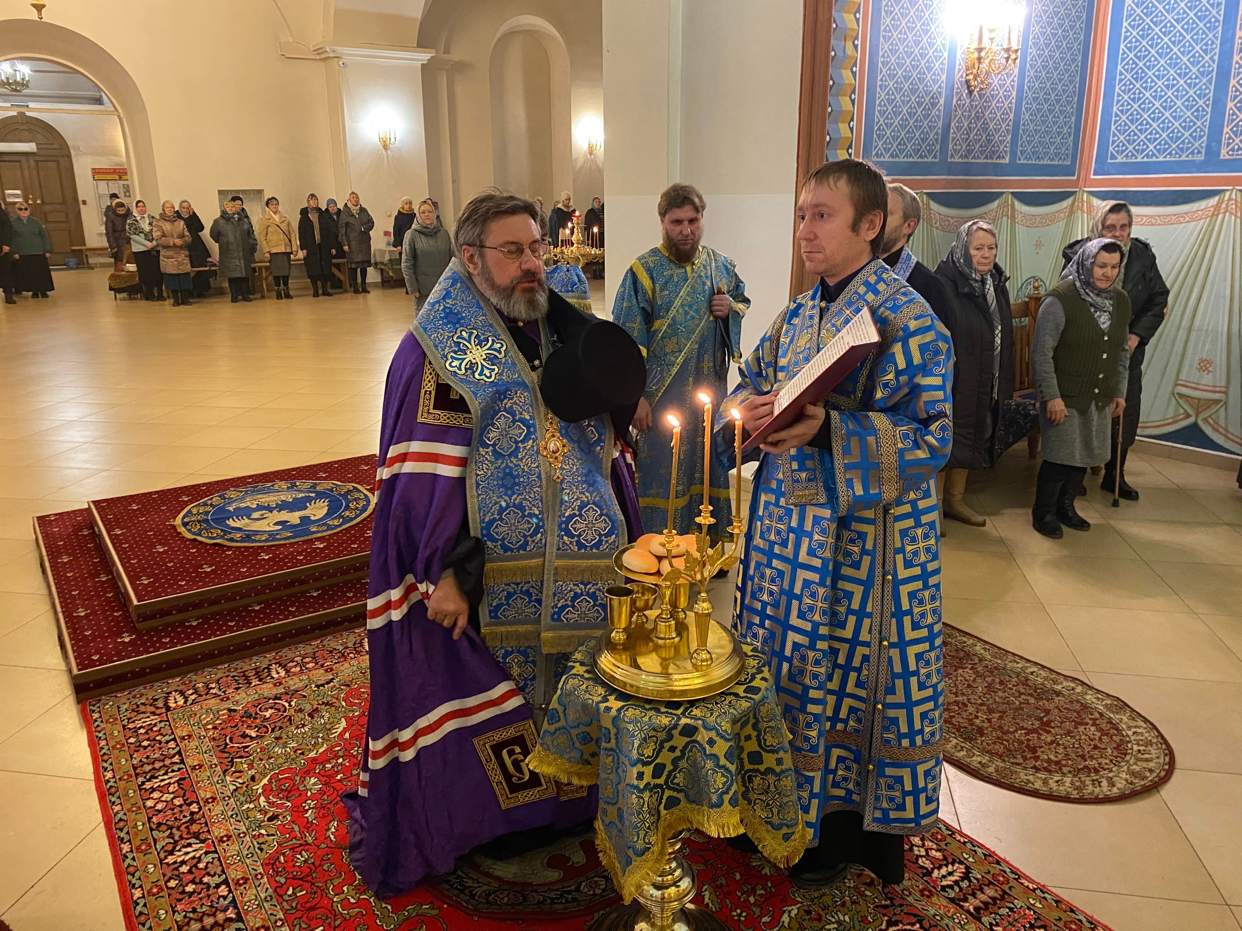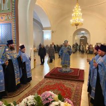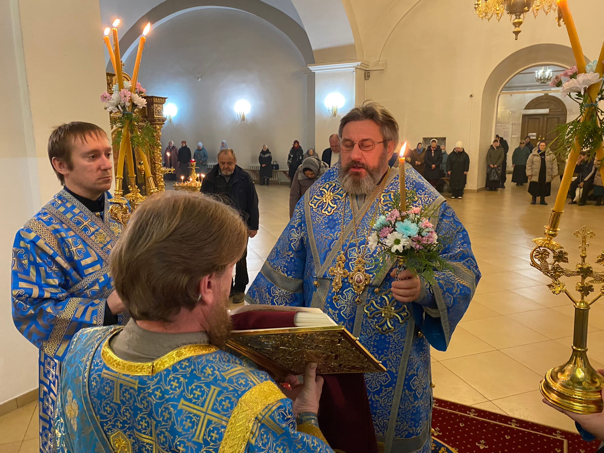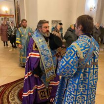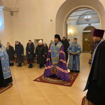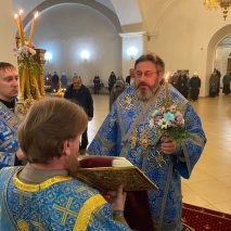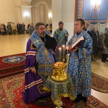 Его Преосвященству сослужили: секретарь епархиального управления иерей Антоний Чуть, иерей Алексий Ануфриев, иерей Виталий Ярмулик, иерей Олег Федоров и иерей Алексий Беляков.