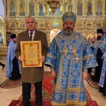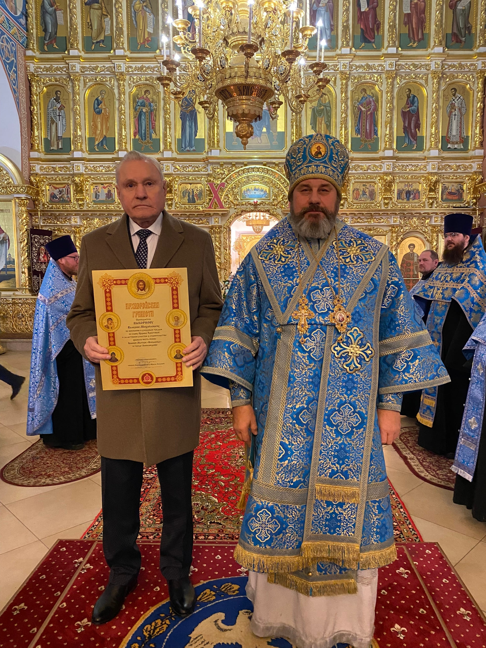 После прочтения Евангелия во внимание к усердным трудам во славу Церкви Христовой и за активное участие в строительстве храма в честь иконы Божией Матери «Всецарица» в городе Александрове, Выборнов Валерий Михайлович награжден Архиерейской грамотой.