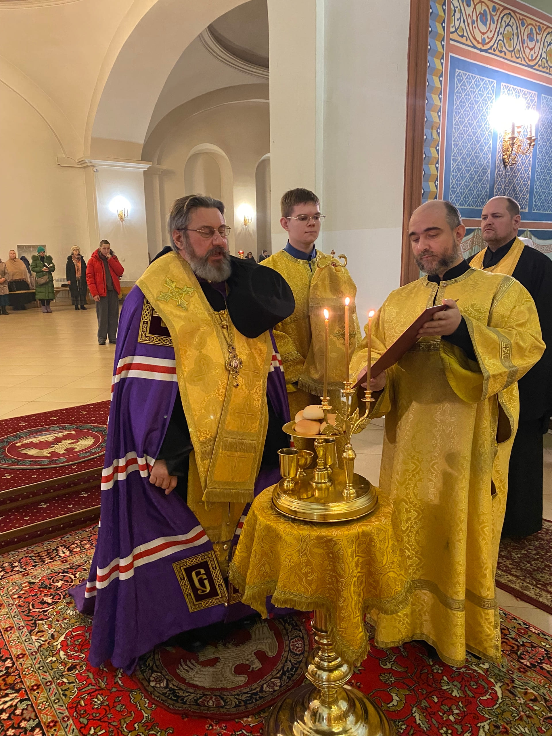 На вечерне Архипастырь возглавил служение литии с освящением пяти хлебов, пшеницы, вина и елея.