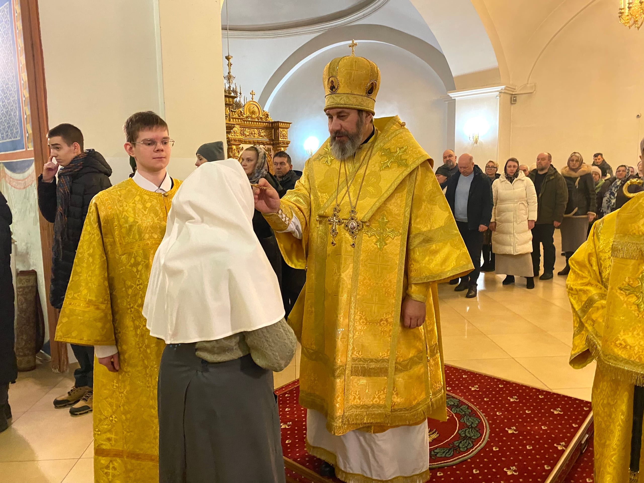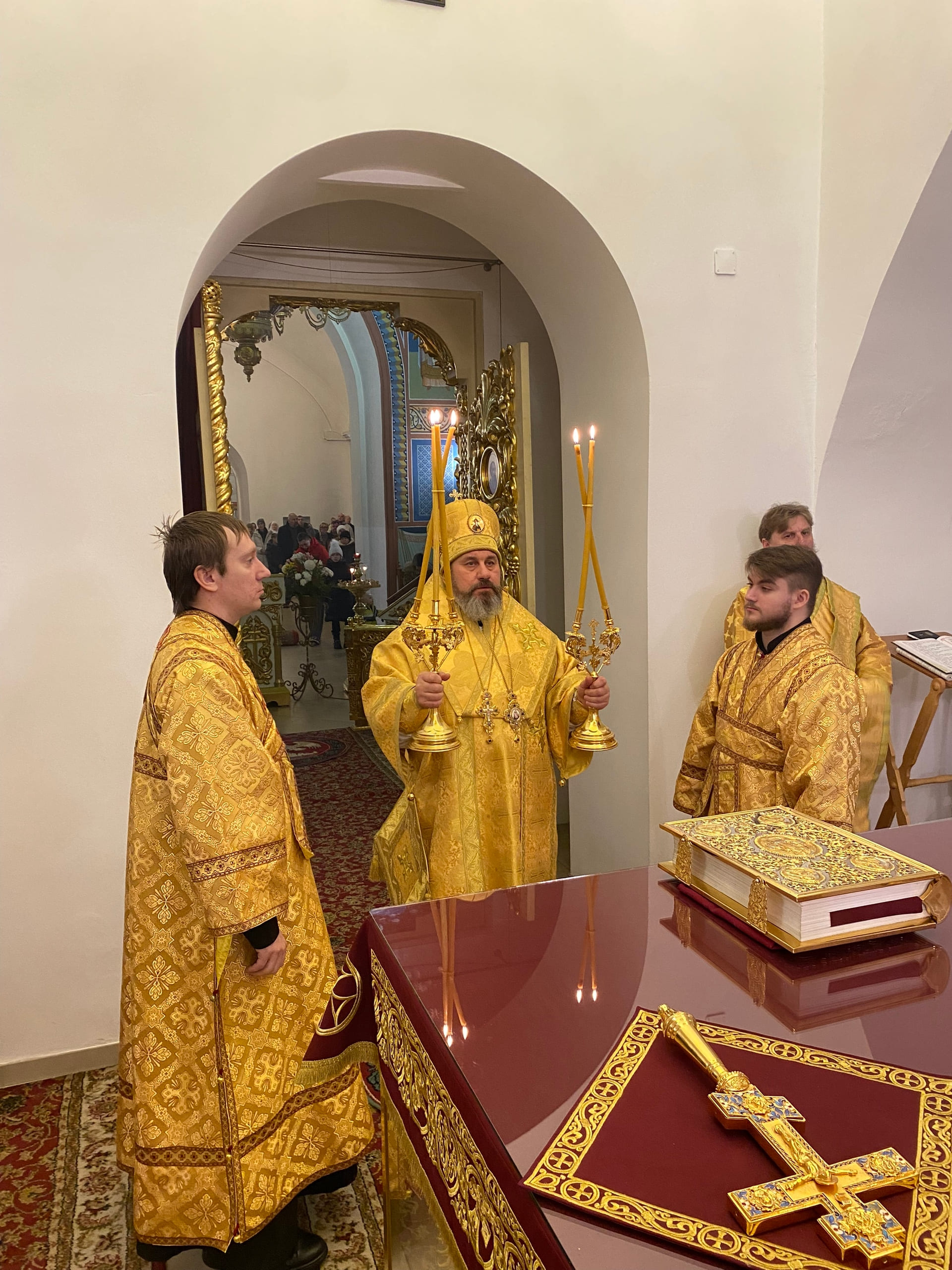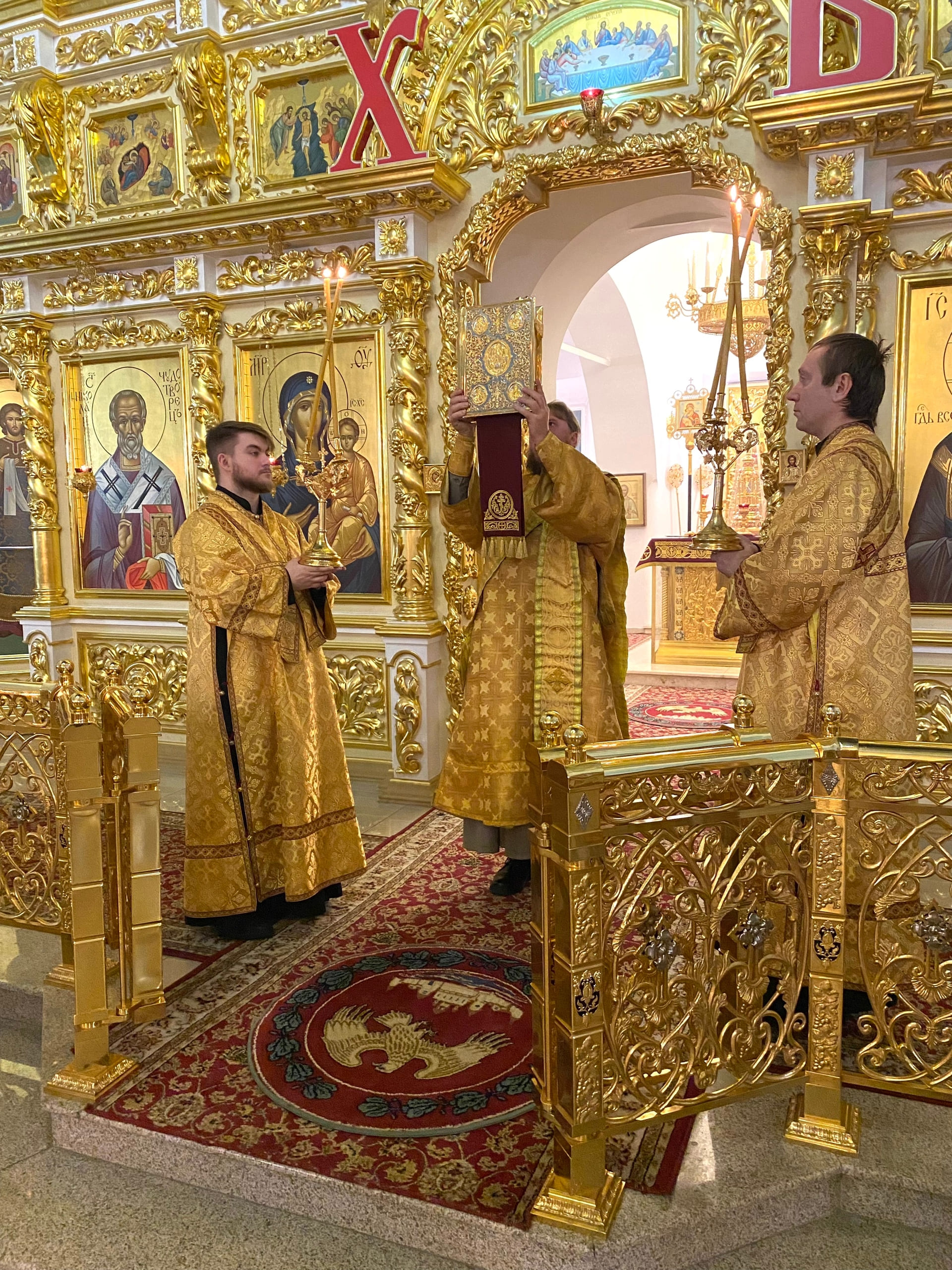 Его Преосвященству сослужили: секретарь епархиального управления иерей Антоний Чуть, иерей Алексий Ануфриев, иерей Виталий Ярмулик и иерей Алексий Беляков.