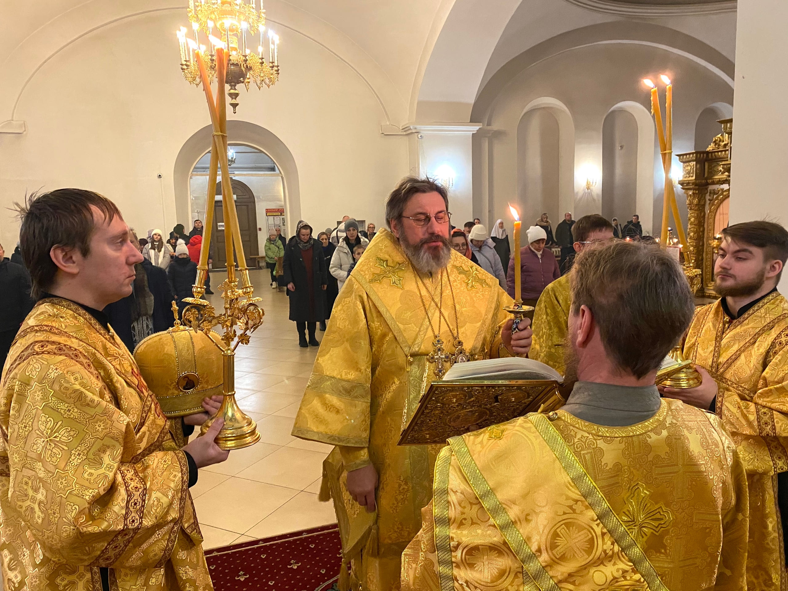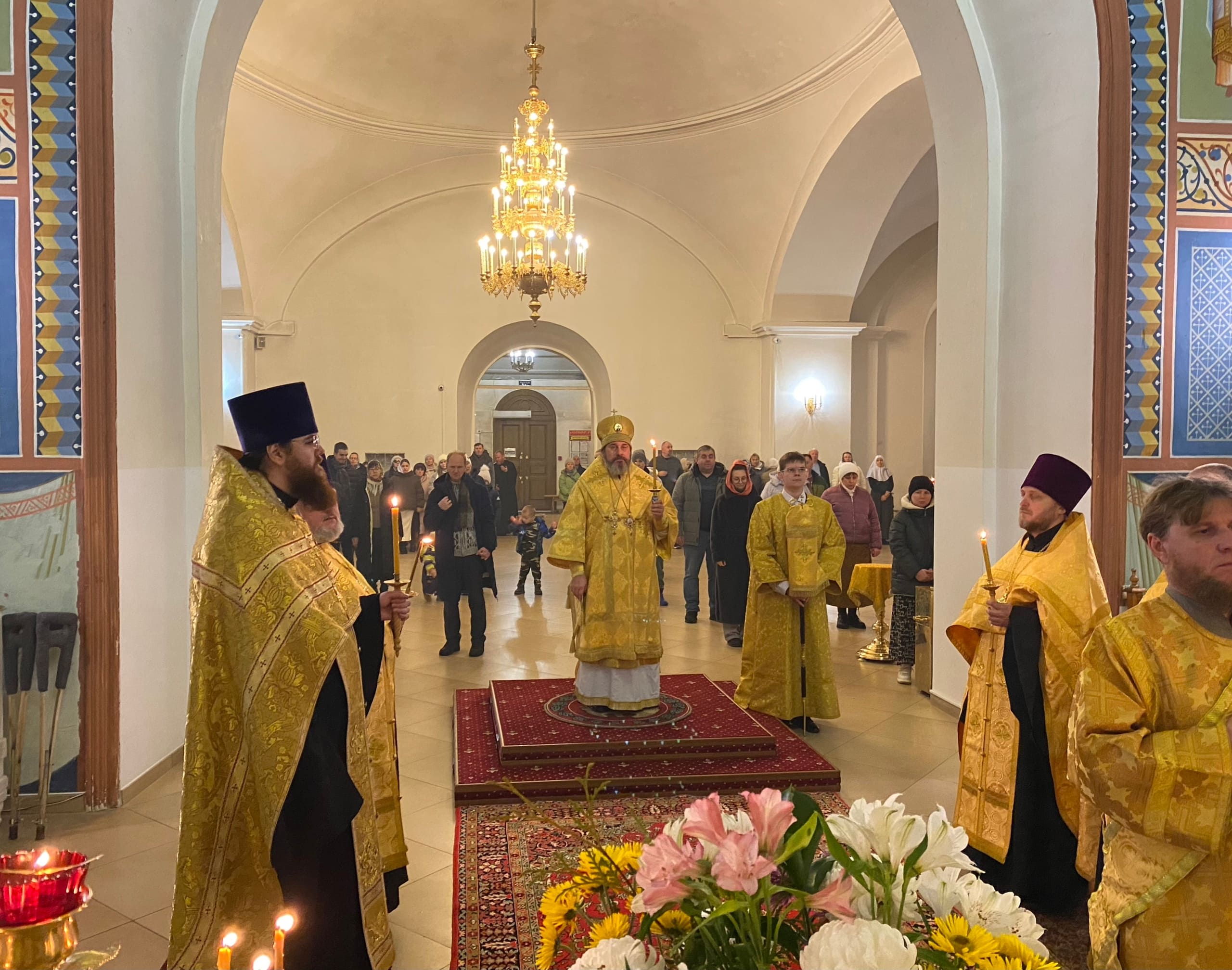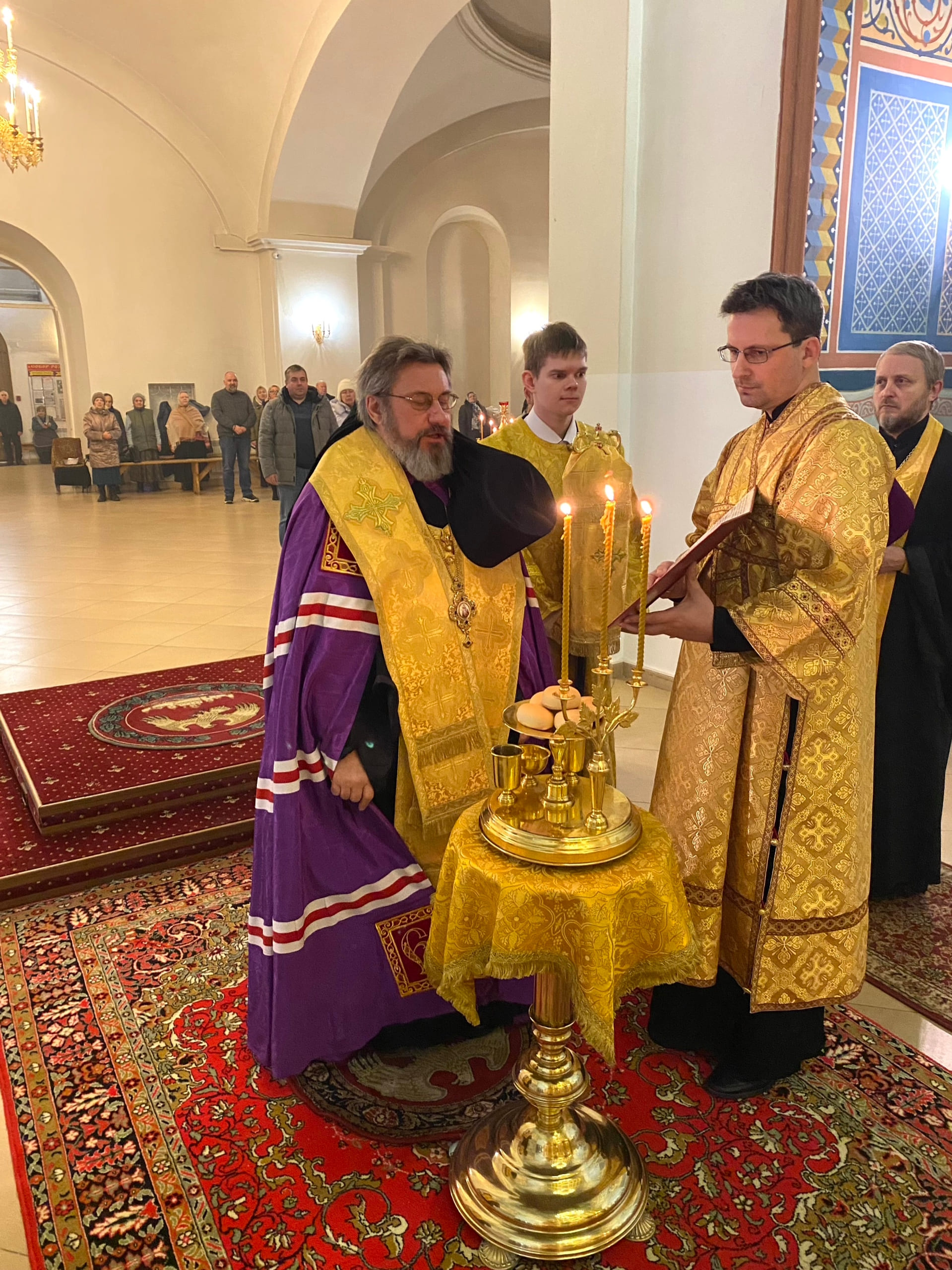 Его Преосвященству сослужили: секретарь епархиального управления иерей Антоний Чуть, иерей Алексий Ануфриев, иерей Виталий Ярмулик и иерей Алексий Беляков.