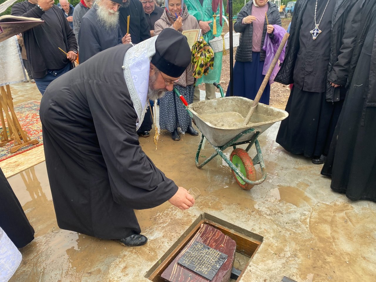 В ходе чина Архипастырь прочитал особые молитвы, затем окропил святой водой и святым елеем закладную плиту, которая была заложена в фундамент в алтарной части.