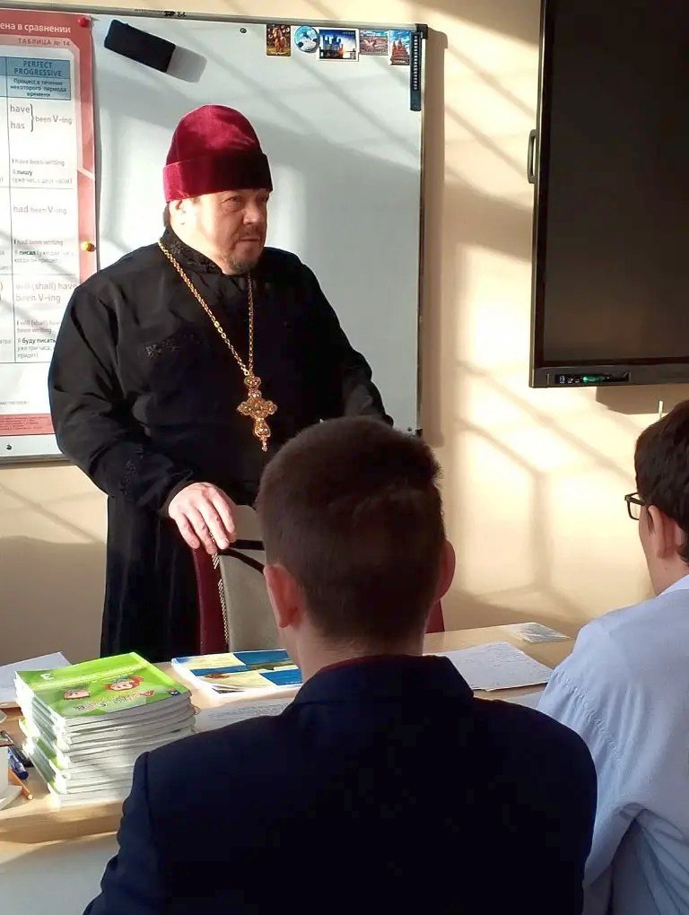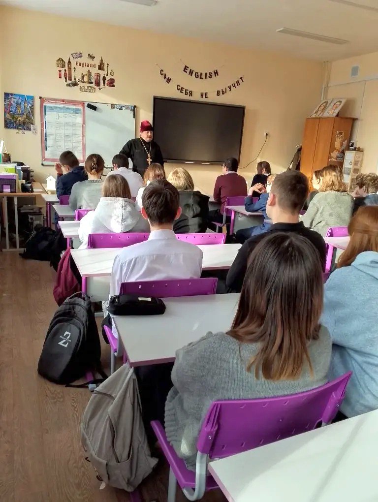 19 февраля руководитель Миссионерского отдела, клирик храма преподобного Серафима Саровского протоиерей Георгий Шинкаренко провел встречу с учащимися 9 класса школы №5 имени старшего лейтенанта В.В. Зиненко.