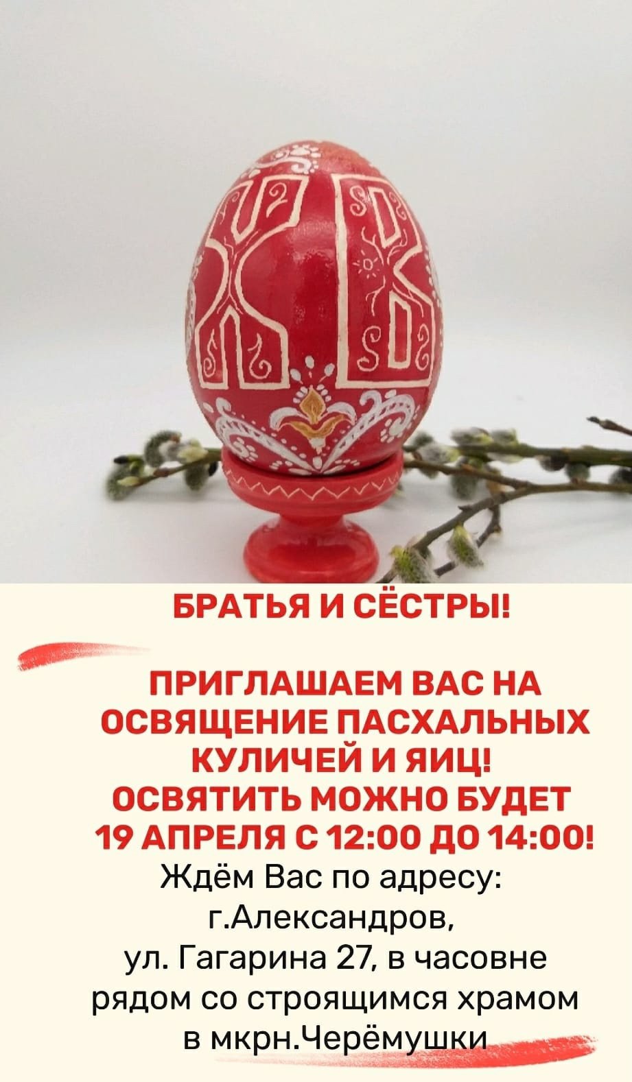 Дорогие братья и сёстры! По благословению Преосвященного епископа Александровского и Юрьев-Польского Стефана в часовне, расположенной рядом со строящимся храмом (г. Александров, ул. Гагарина 27), будет совершаться освящение пасхальных куличей и яиц.