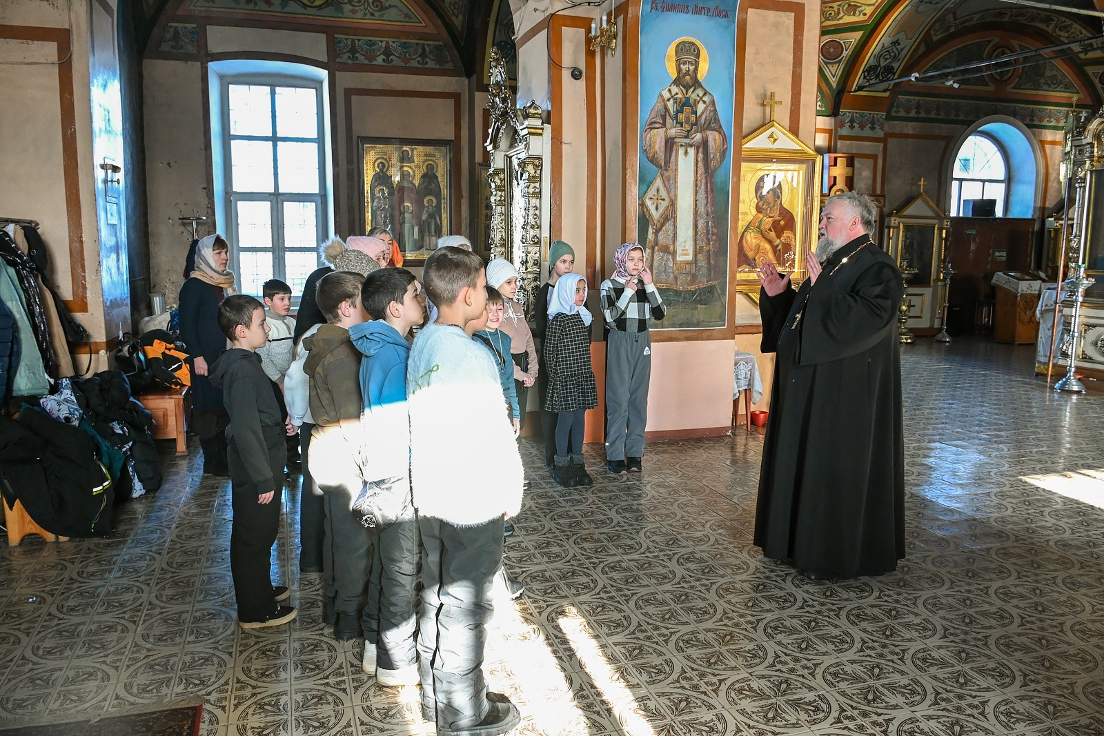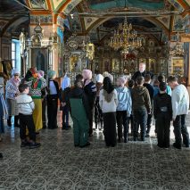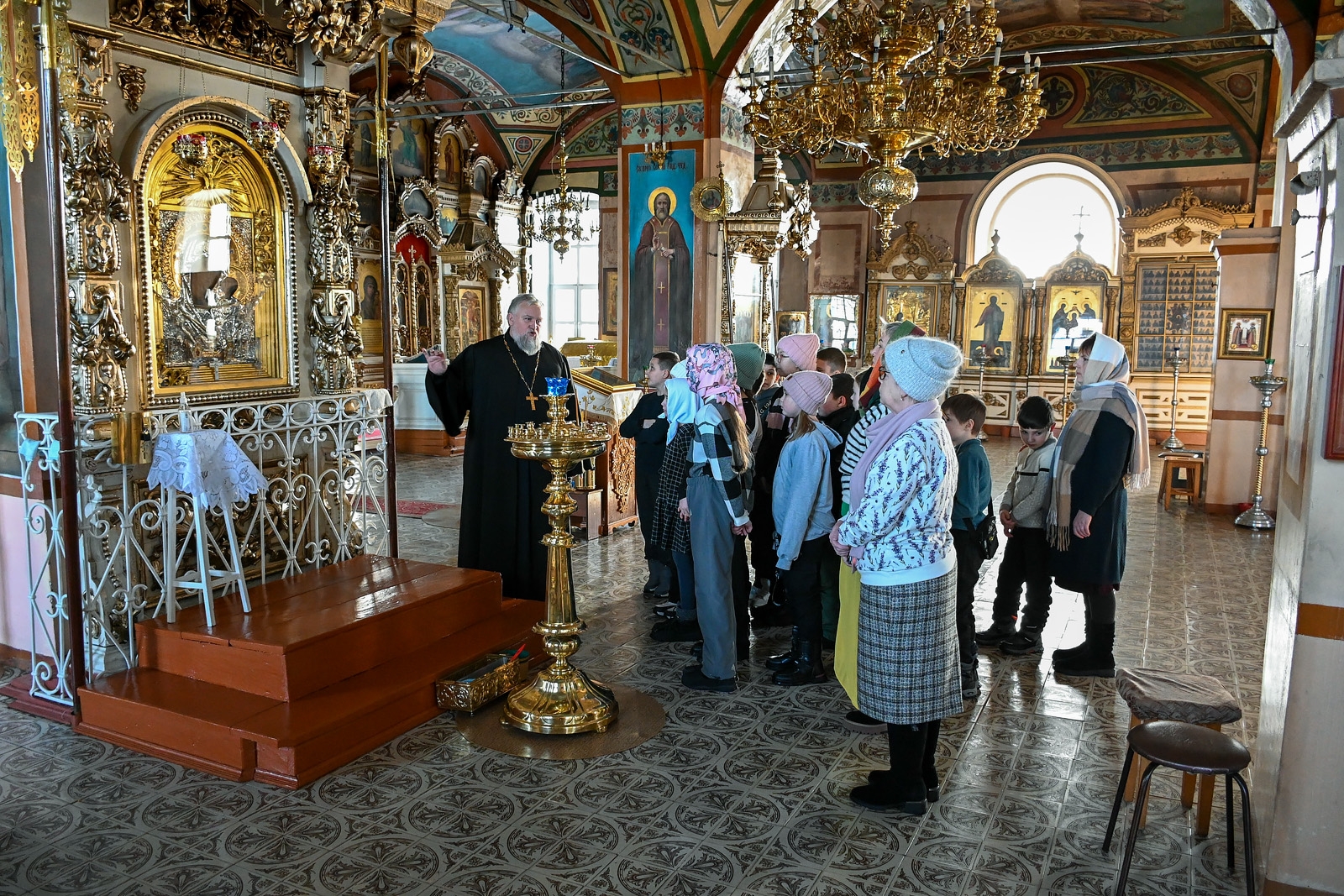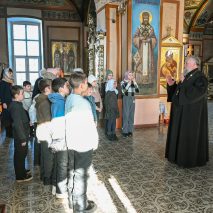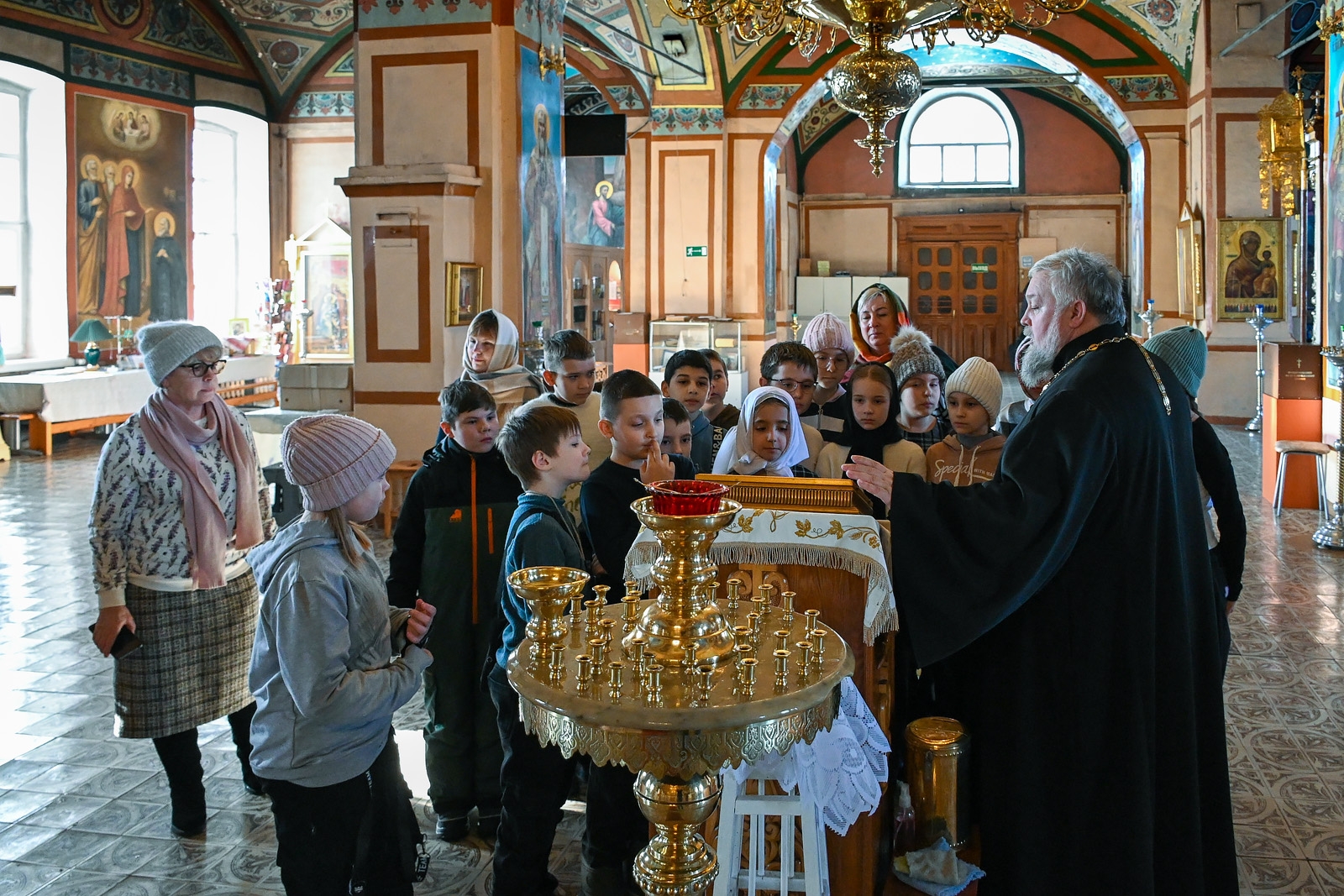 Настоятель прихода отец Алексий Нестеров встретил гостей и провёл для них познавательную экскурсию. Он рассказал об устройстве и символике православного храма, истории старинных икон и святынь. Участники смогли рассмотреть внутреннее убранство, включая росписи и паникадило, а также поставить свечи.