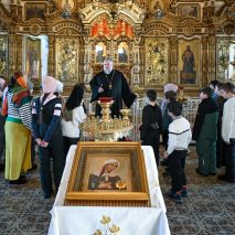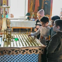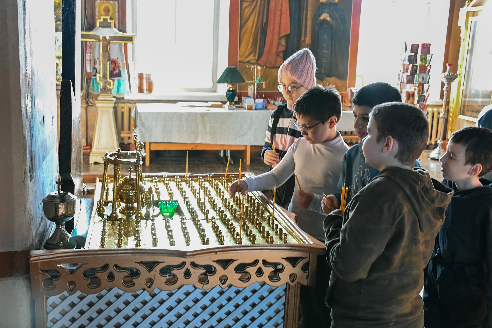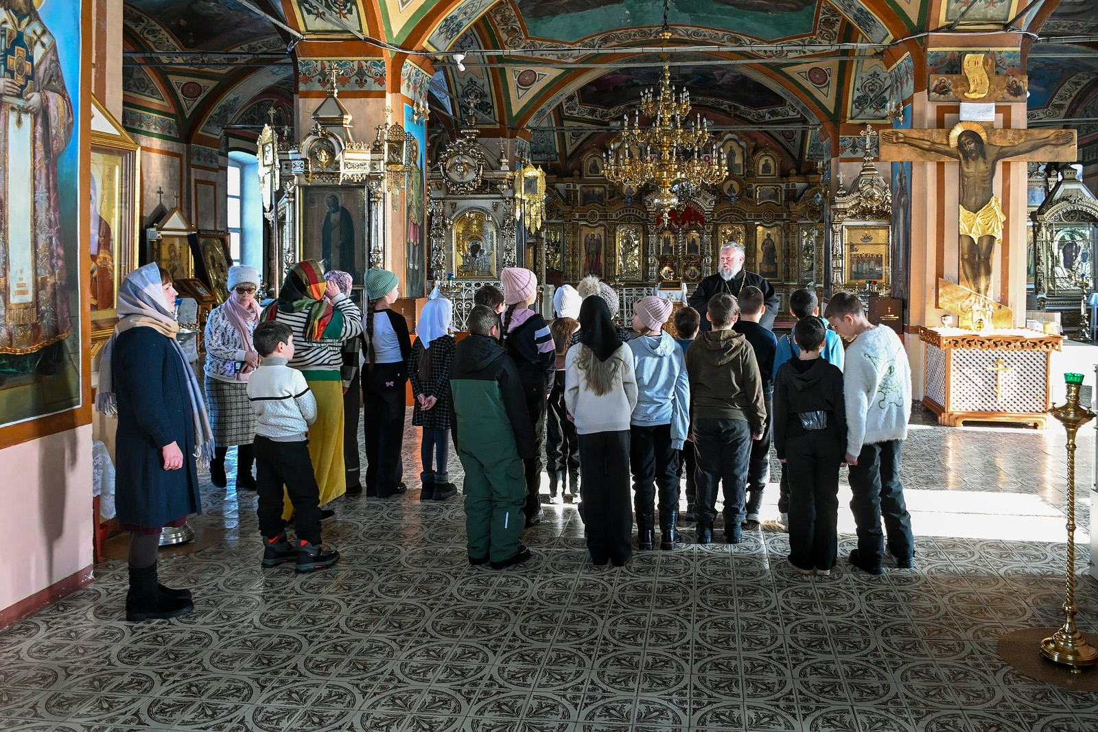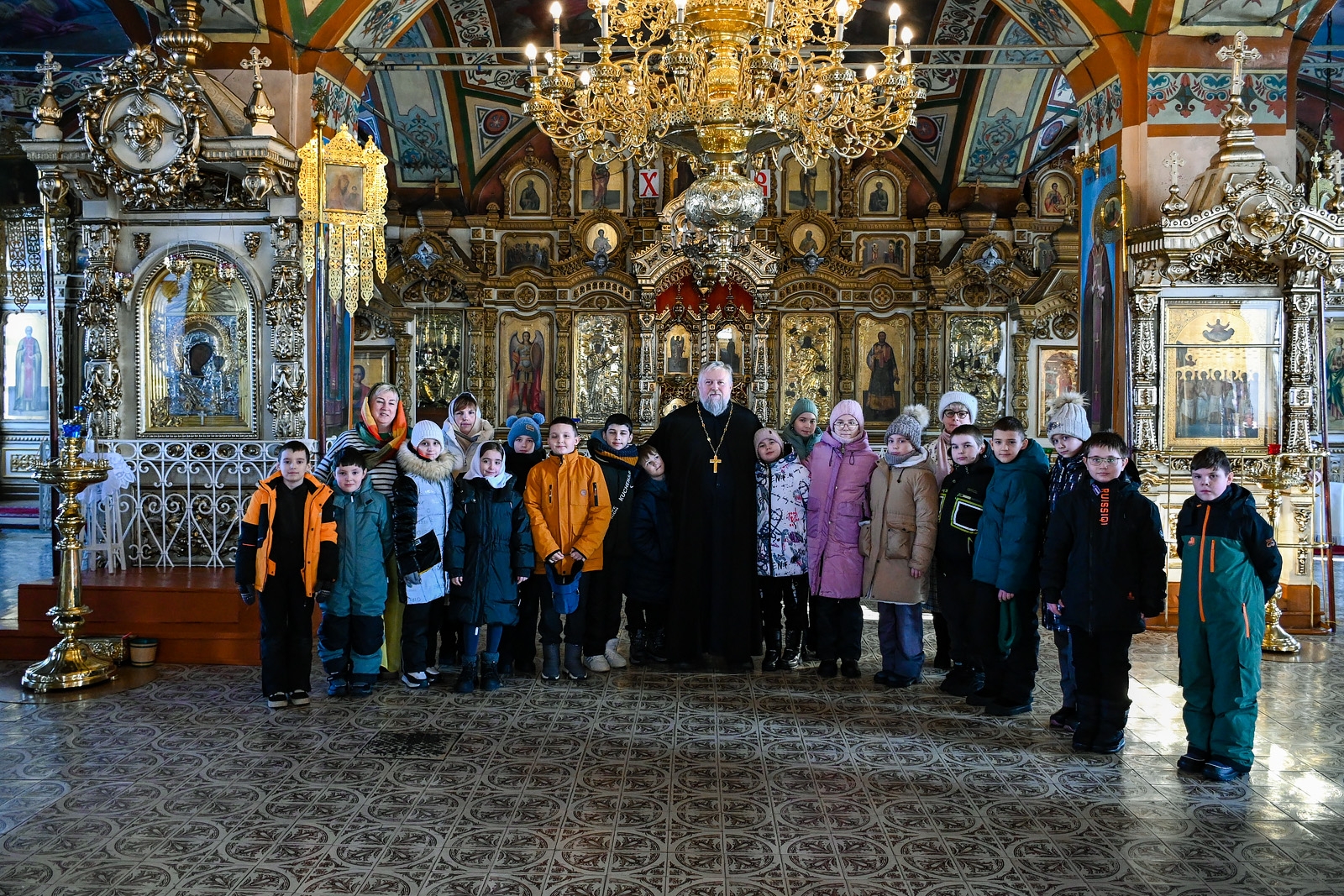 Настоятель прихода отец Алексий Нестеров встретил гостей и провёл для них познавательную экскурсию. Он рассказал об устройстве и символике православного храма, истории старинных икон и святынь. Участники смогли рассмотреть внутреннее убранство, включая росписи и паникадило, а также поставить свечи.