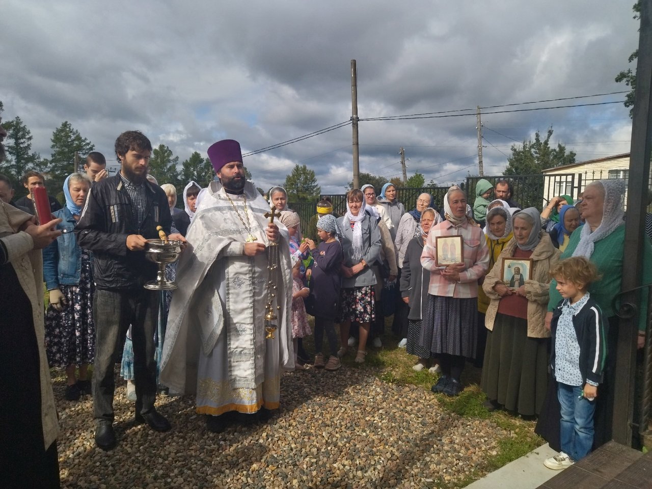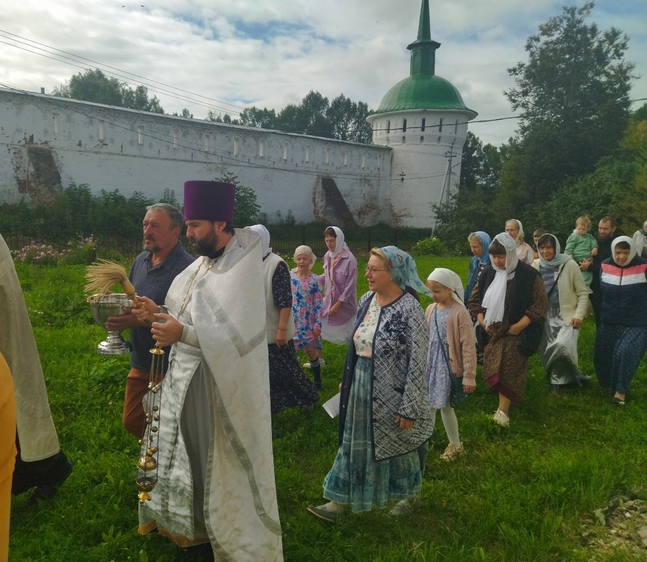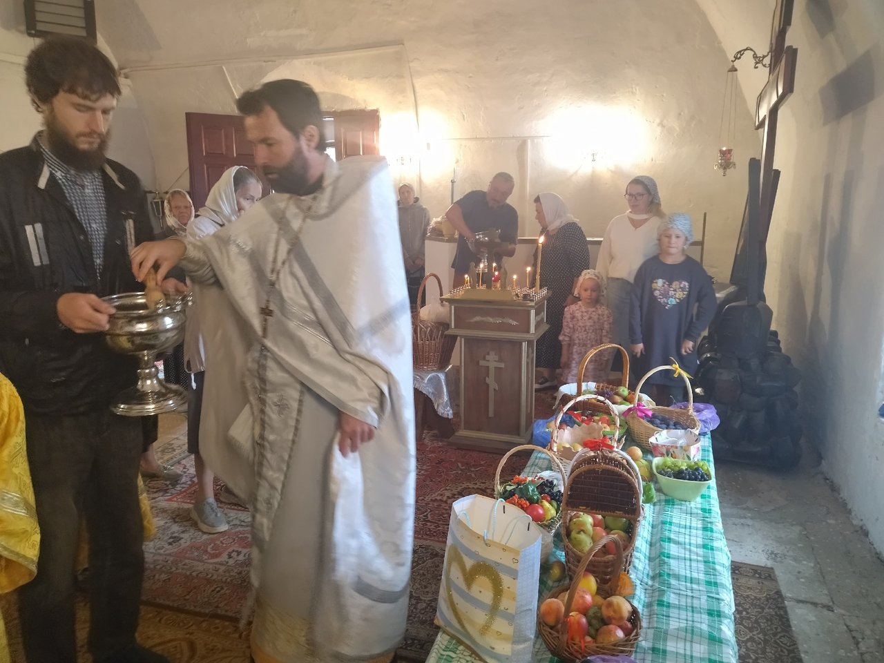 После литургии вокруг храма был совершен крестный ход, в завершении которого по традиции были освящены плоды нового урожая.