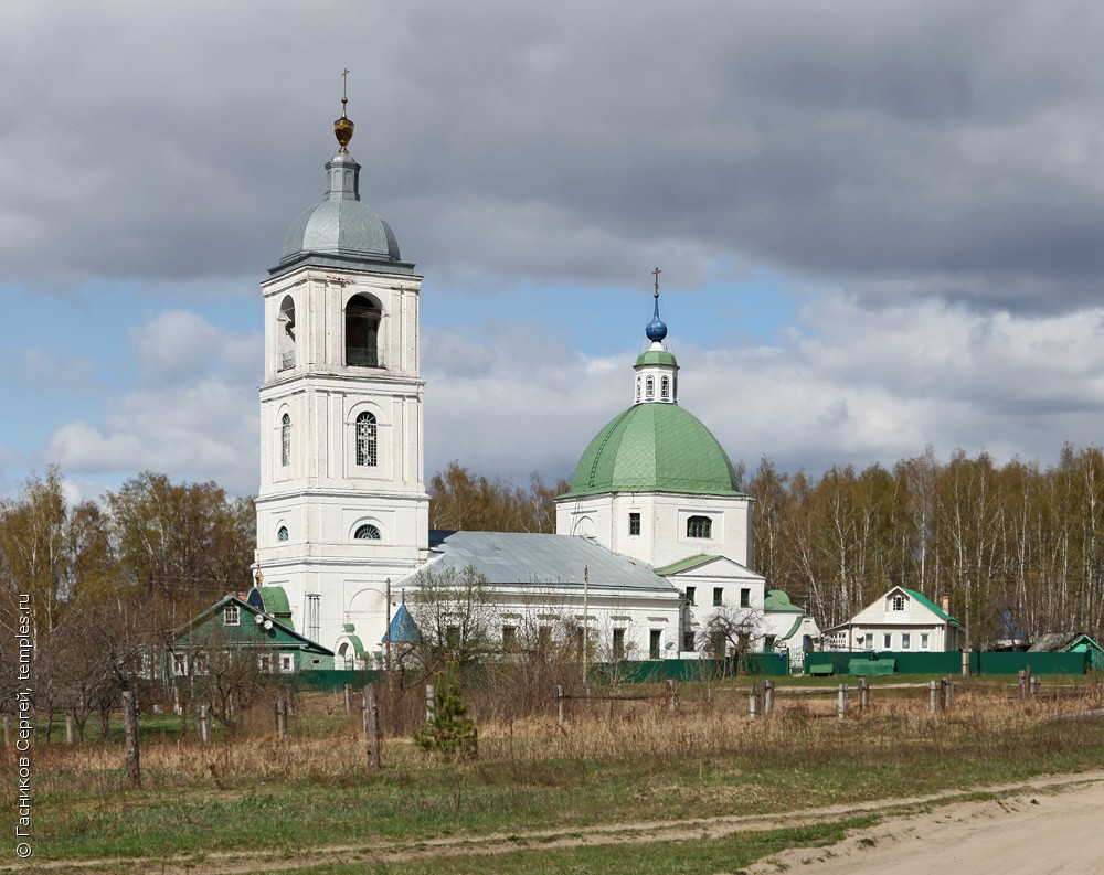 В архитектуре храма явно преобладают черты классицизма. Основное здание храма выполнено в форме двухэтажного четверика с массивным сферическим граненым куполом, на котором возвышается главка на небольшом барабанчике. Центральный вход украшает классический фронтон. С западного торца располагается помещение трапезной, расширенное за основную линию, к которой примыкает трехъярусная колокольня с широкими карнизами и сдвоенными пилястрами по граням. Наружная отделка проста и лаконична, стены оштукатурены и выкрашены. Храм трехпрестольный. Центральный престол освящен 26 сентября 1825 года в честь Богоявления Господня Архимандритом Боголюбова монастыря Никодимом. Южный престол освящен 22 декабря 1861 года в честь Усекновения главы Иоанна Предтечи, а северный — в честь преподобного Сергия Радонежского. Иконостасы придельных храмов изготовлены на средства прихожан. Особенно много жертвовал для храма церковный староста, покровский купец Павел Данилович Кузнецов. Его сын Иван Павлович на свои средства произвел в храме ремонт. В начале 20 века он выстроил храм Успения Божией Матери в селе Старые Петушки. В советское время храм не закрывался.